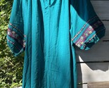 The Pioneer Woman 3X dress is a teal blue midi lounge MuuMuu with embroidered sleeves, perfect for casual occasions or travel. Made from a silky rayon/poly blend fabric with a subtle crinkle texture, this pullover dress features a round neck w/modest V-neck for added comfort and half sleeves, giving it a peasant shift style with a flowy design. Easy to care for with machine washable instructions, this somewhat peasant boho-themed dress is suitable for all seasons, offering a comfortable and stylish option for women looking for a relaxed yet chic outfit. Length: 40" ~ Bust 60" all around