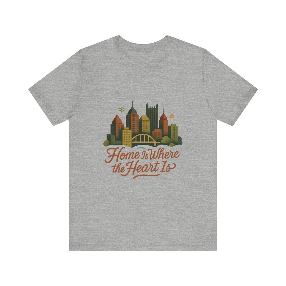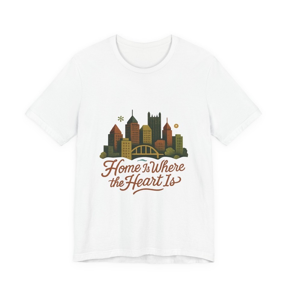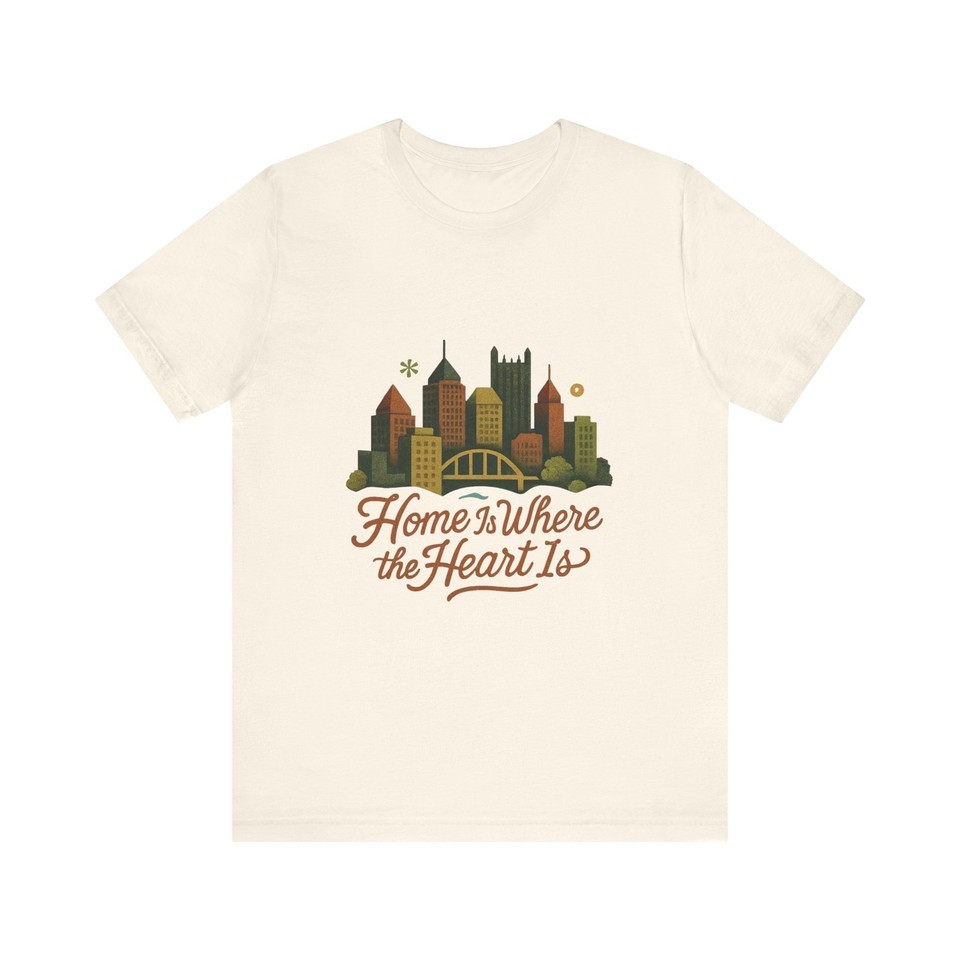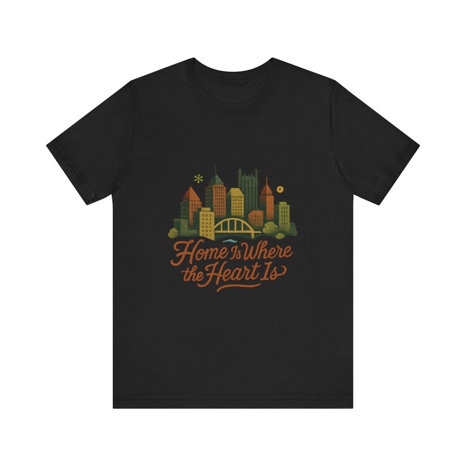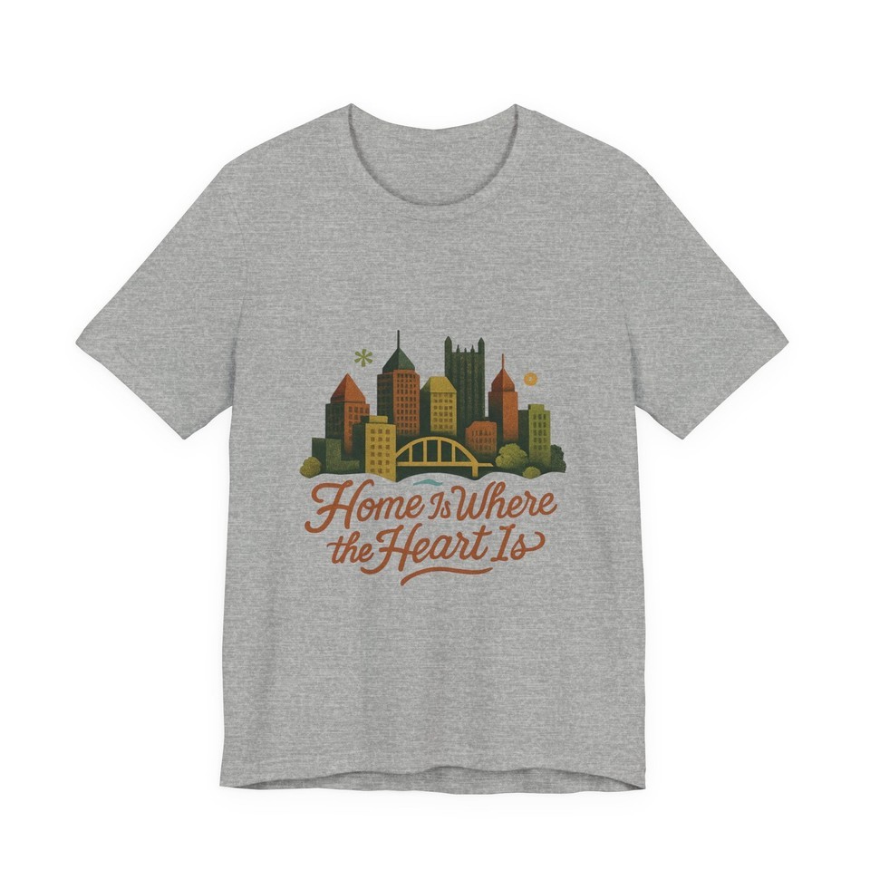 Show off your Pittsburgh pride with this unisex jersey short sleeve tee that features a 'Home is where the Heart is' design. Perfect for those who call Pittsburgh home and want to showcase their love for the city. Ideal for casual wear or as a gift for Pittsburgh natives on holidays, birthdays, or special occasions.