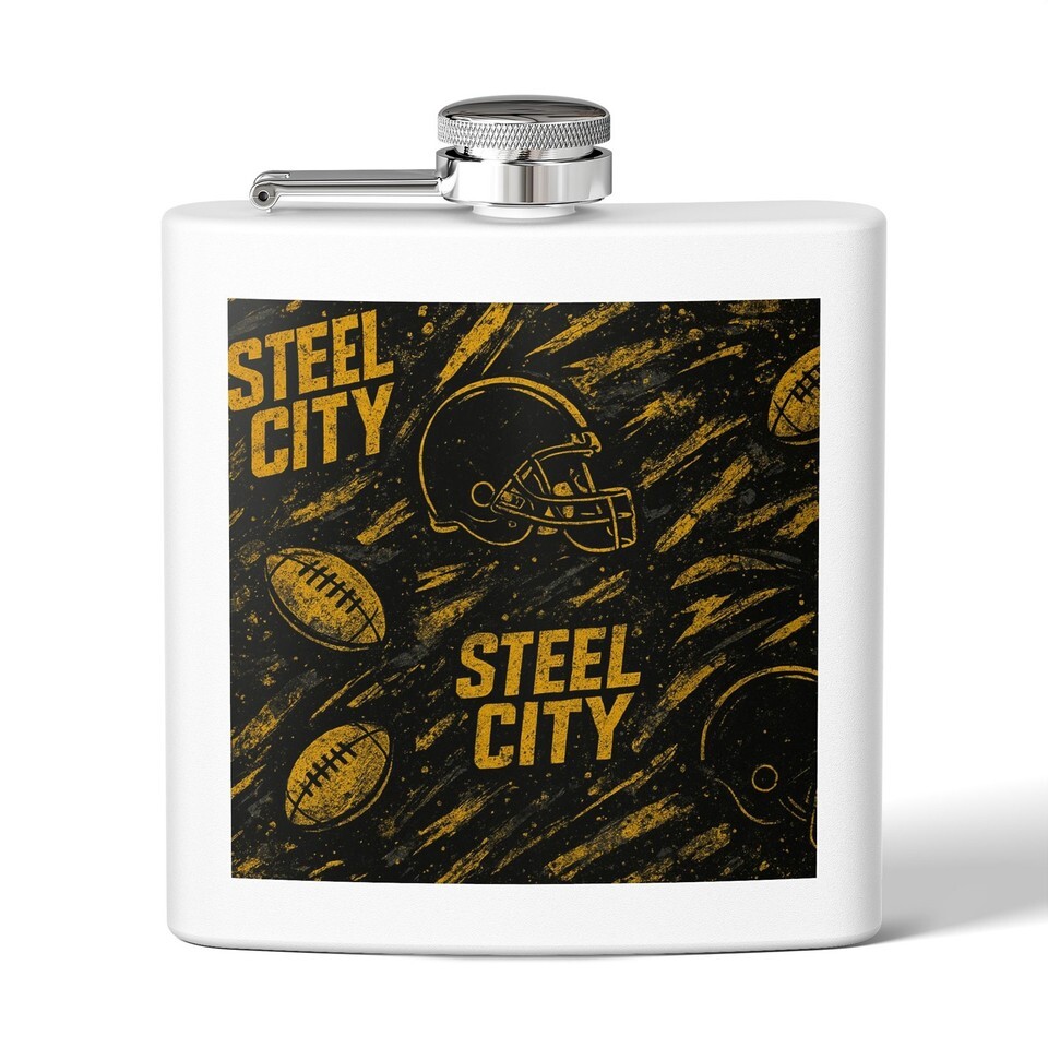 This 6oz stainless steel flask brings gritty, game-day energy in a compact, durable package. The powder-coated exterior holds a bold, vintage-inspired sports print ? distressed helmets, flying footballs, and the rallying words ?Steel City? ? that wears like a proud badge. Double-wall insulation keeps spirits at the right temperature for hours, while a secure, leak-proof lid with an easy latch keeps pockets and bags safe. It?s small enough to slip into a coat or backpack, and rugged enough to travel from tailgate to campsite without fuss. Hand-wash care preserves the UV DTF print and finish so the design stays sharp through seasons of use.