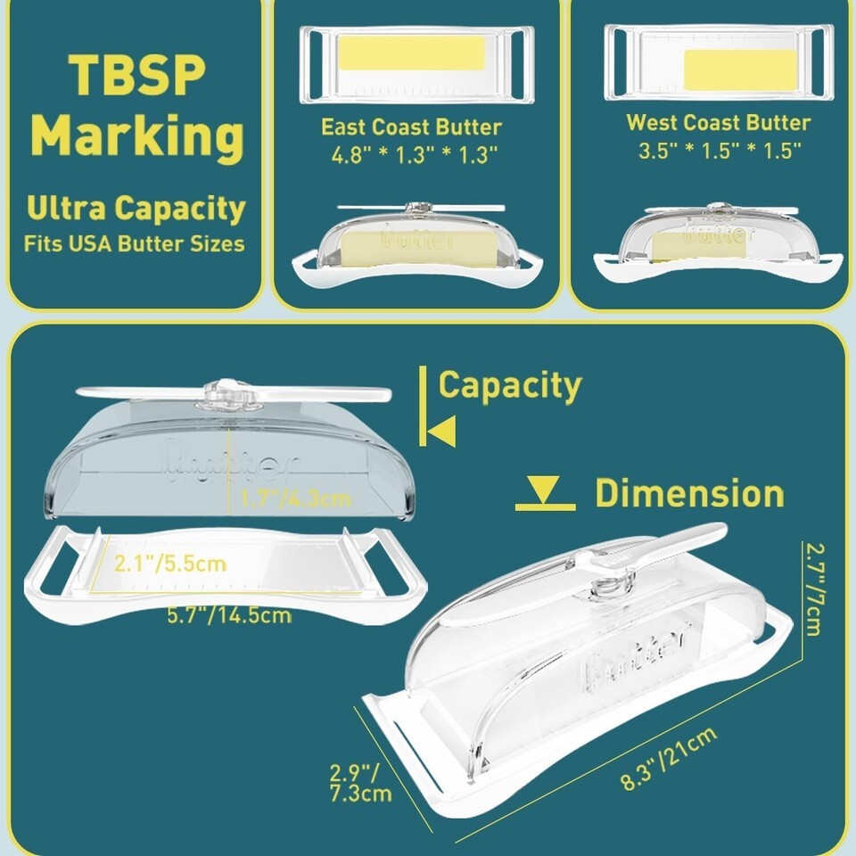 ?Perfect Size Versatile Use? With dimensions of 8.3 inches in length, 2.9inches in width, and 2.7 inches in height, this butter dish is just the right size to accommodate both East and West Coast/European butter. The interior is spacious enough to ensure that your butter won't touch the top or edges of the lid, providing optimal storage for your butter needs. Use it to store butter in the refrigerator or as a countertop butter keeper.