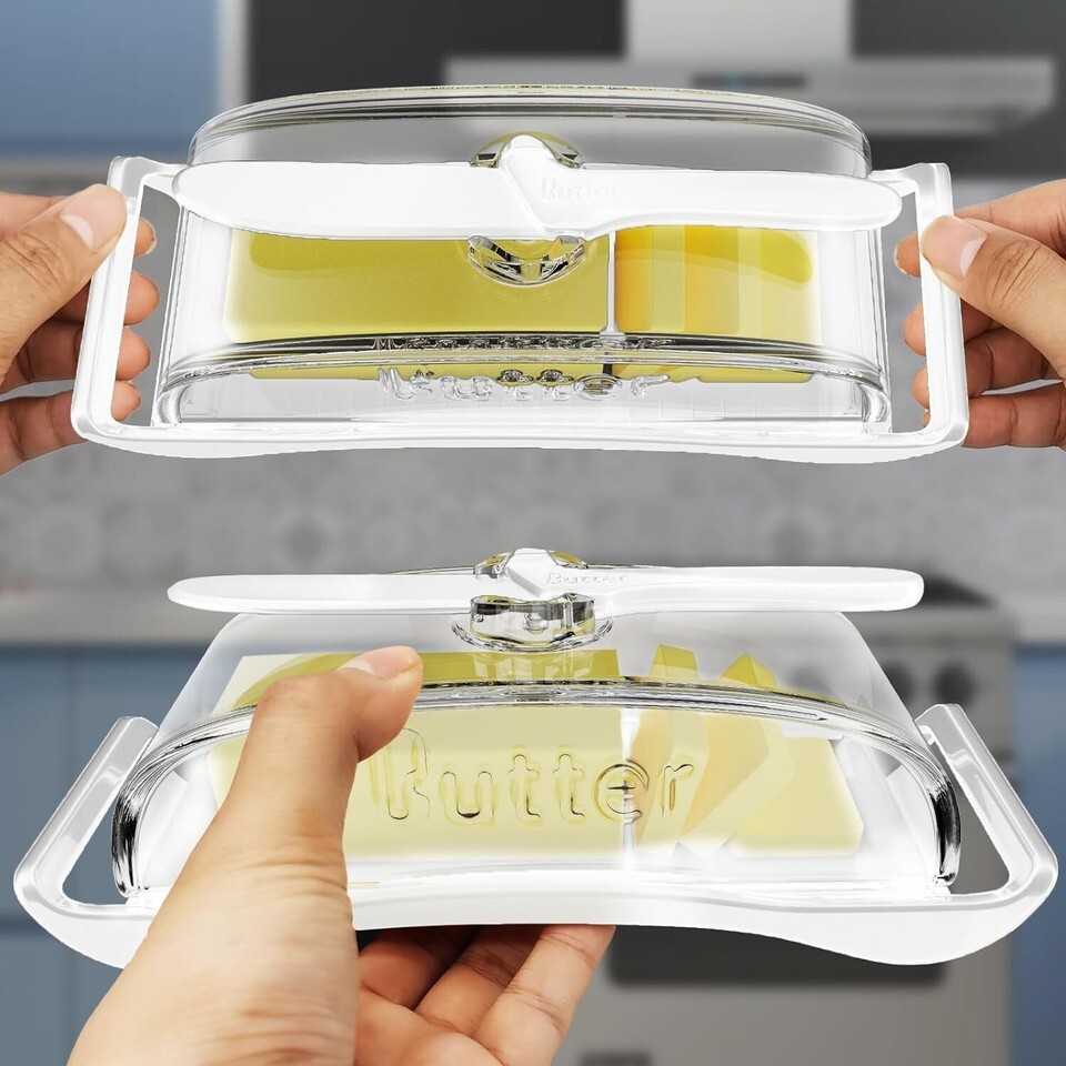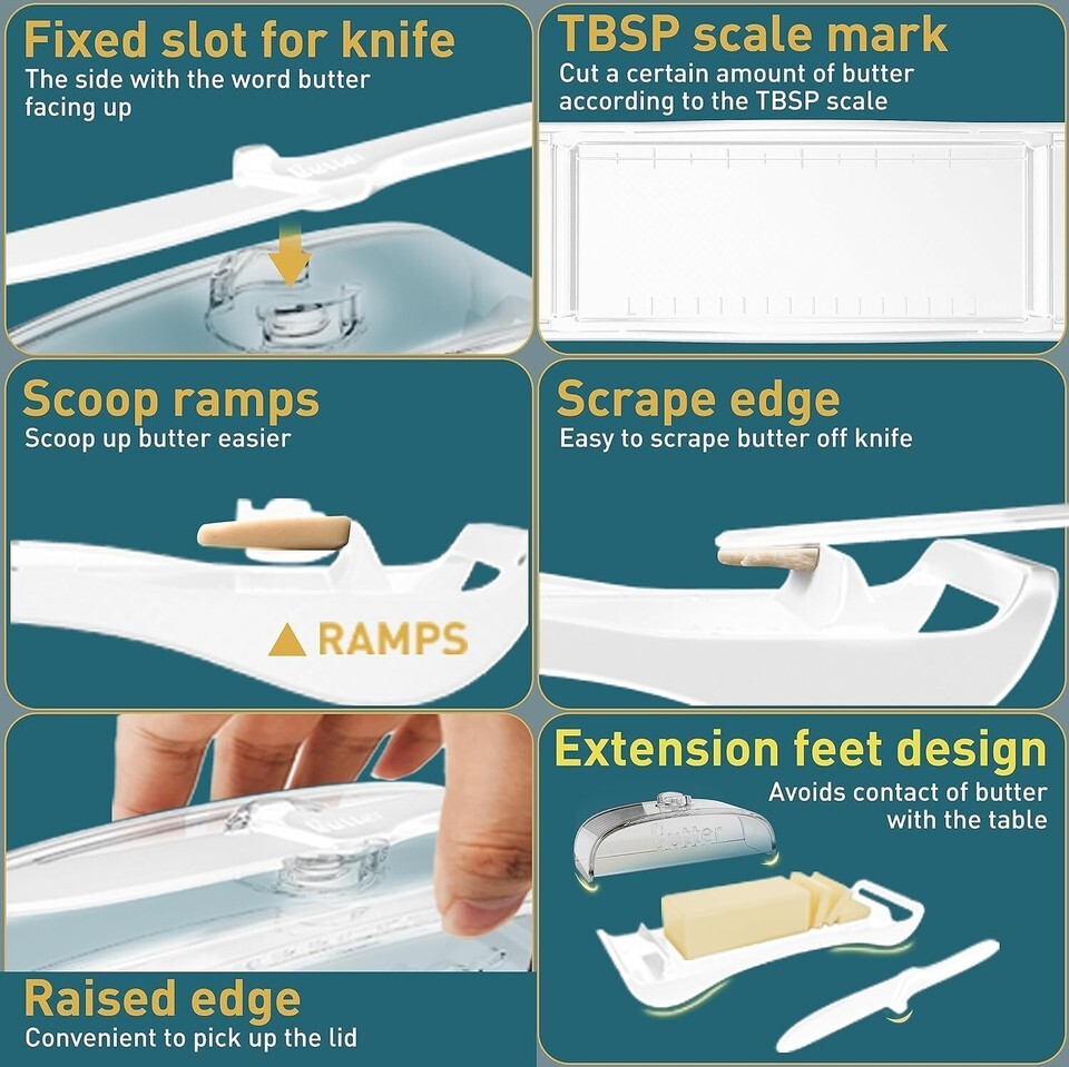 Butter Dish with Lid and Knife?Our butter dish comes with a clear, dust-proof lid and built-in knife for easy spreading and slicing of butter. The lid features a convenient groove where the knife can be easily stored, making it quick and effortless to use. Its unique shape and blade design allow for easy cutting and spreading of butter onto bread or other foods, while the built-in knife ensures that you always have a utensil on hand.