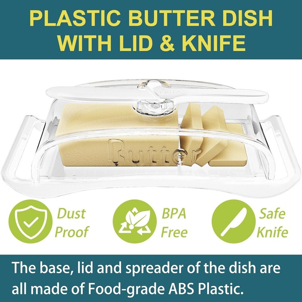 ?High-Quality Material Safe to Use?The butter dish's base, lid, and butter knife are made of food-grade ABS plastic, BPA-free, odorless, sturdy and durable, reusable, stain-proof, and easy to clean. The material is also safe to use and does not contain any harmful chemicals, making it ideal for everyday use in your kitchen.