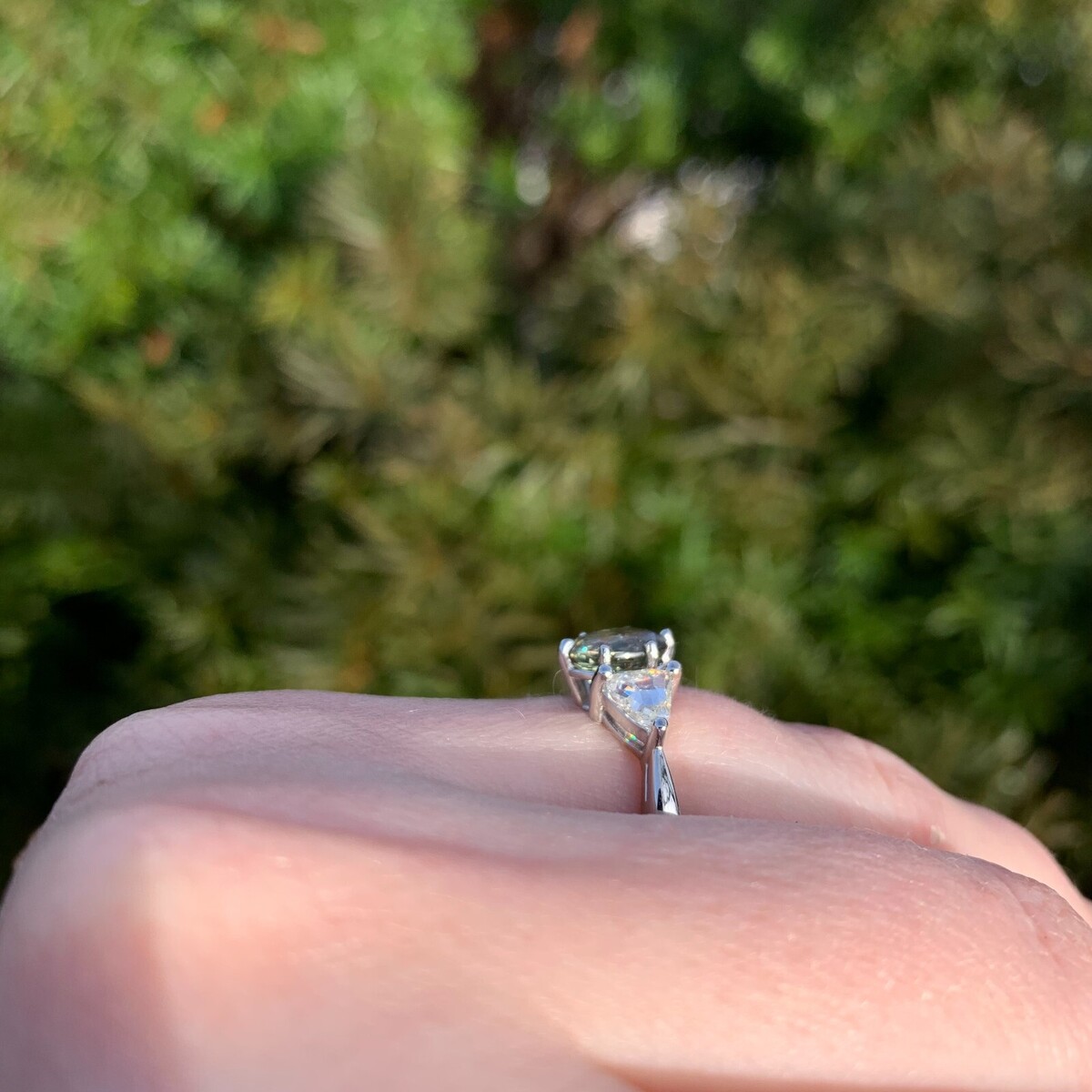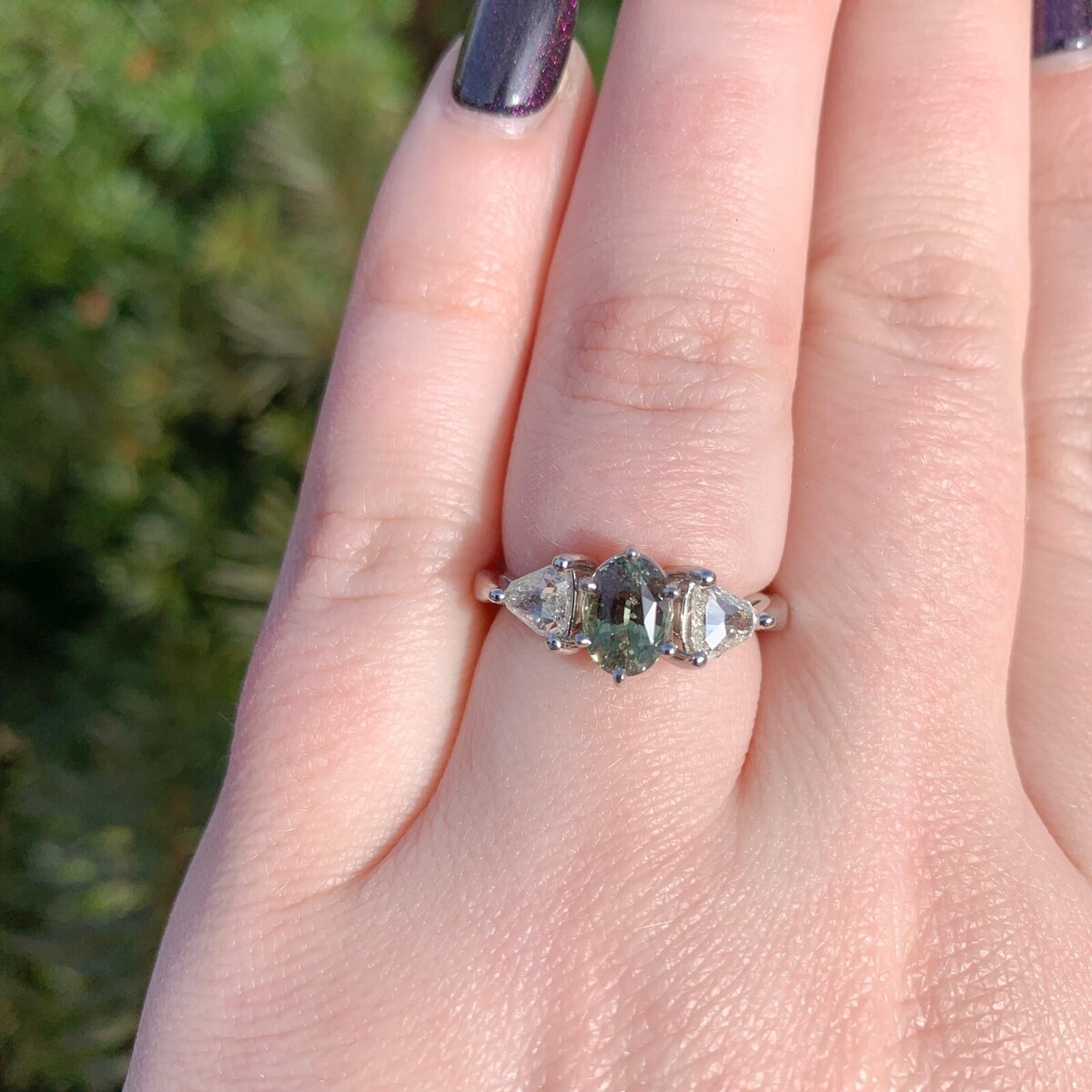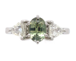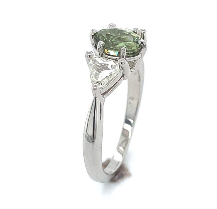 Platinum three stone ring featuring an oval natural alexandrite weighing 1.28 carats and diamonds. GIA report #2213925829 states natural alexandrite measuring 7.27mm x 5.22 x 4.25mm, stating color change from green to brownish yellow. The alexandrite is accented by a pair of antique triangle diamonds weighing .63cts total and measuring about 5mm.