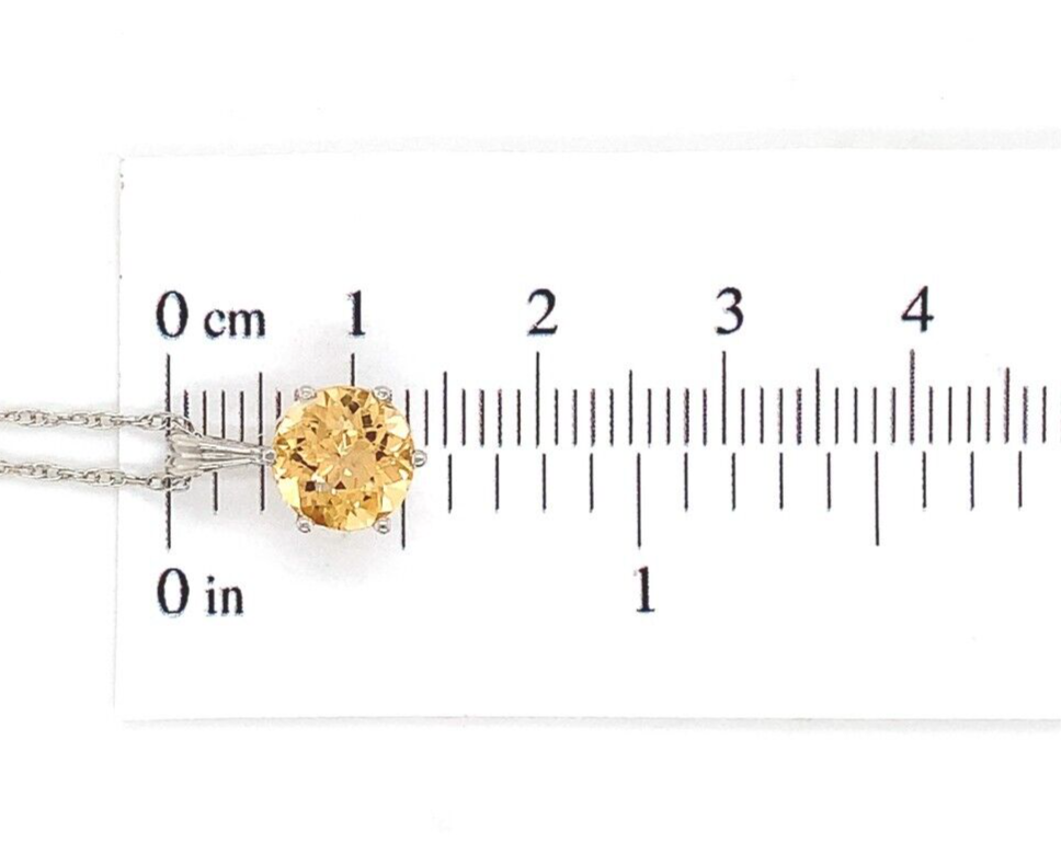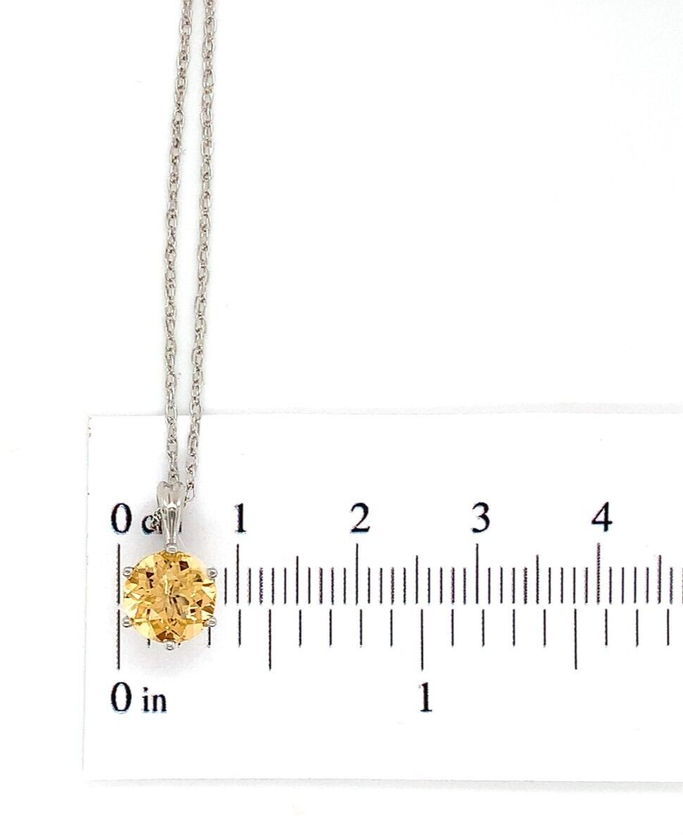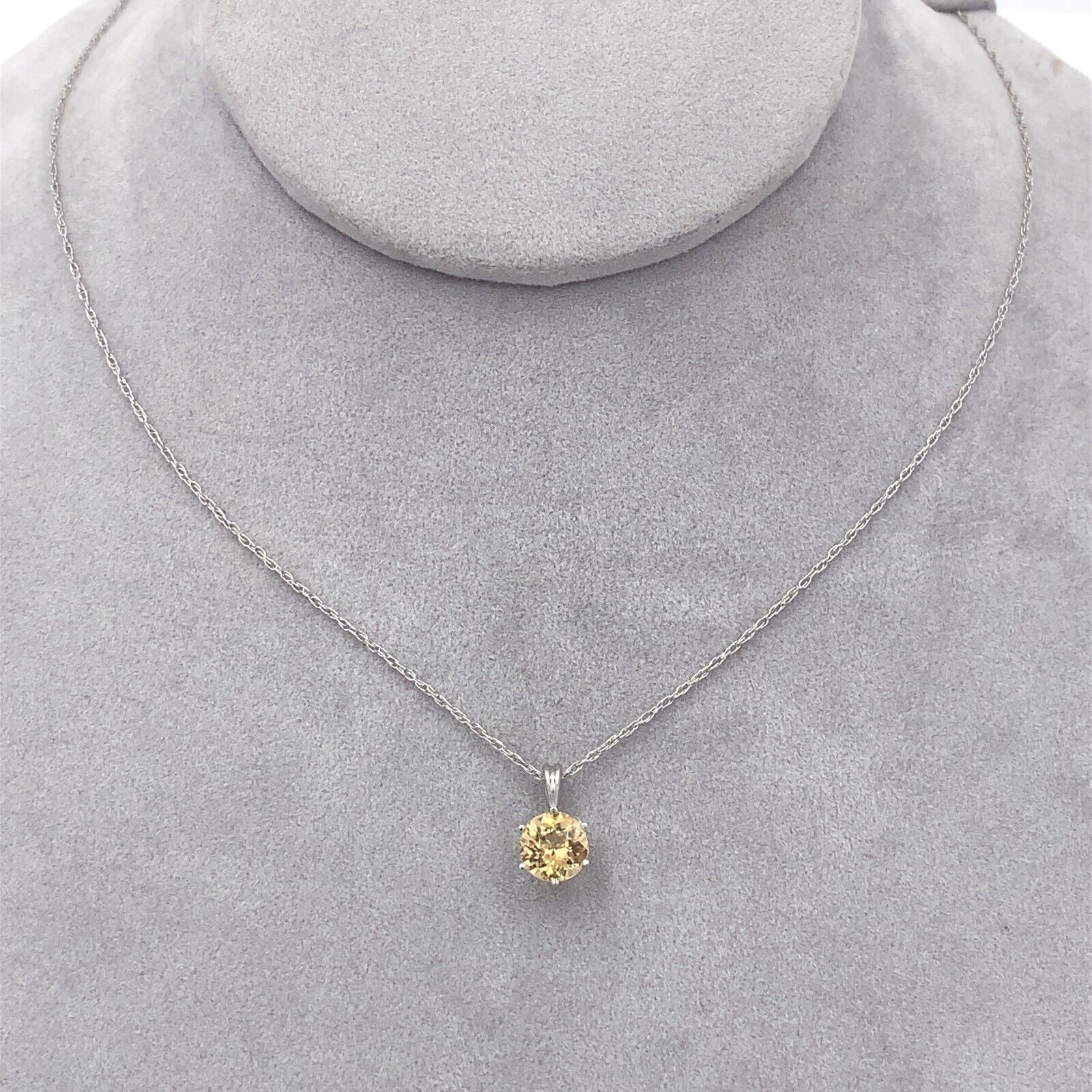 A platinum pendant featuring a round brilliant cut precious topaz weighing 1.98 carats. The topaz is a golden color and is set in a six prong basket. The topaz measures about 7.5mm. The pendant measures 1/2" long with bail and includes a new 18" platinum chain. The necklace weighs 1.82 dwt., and is new. Terrific!
