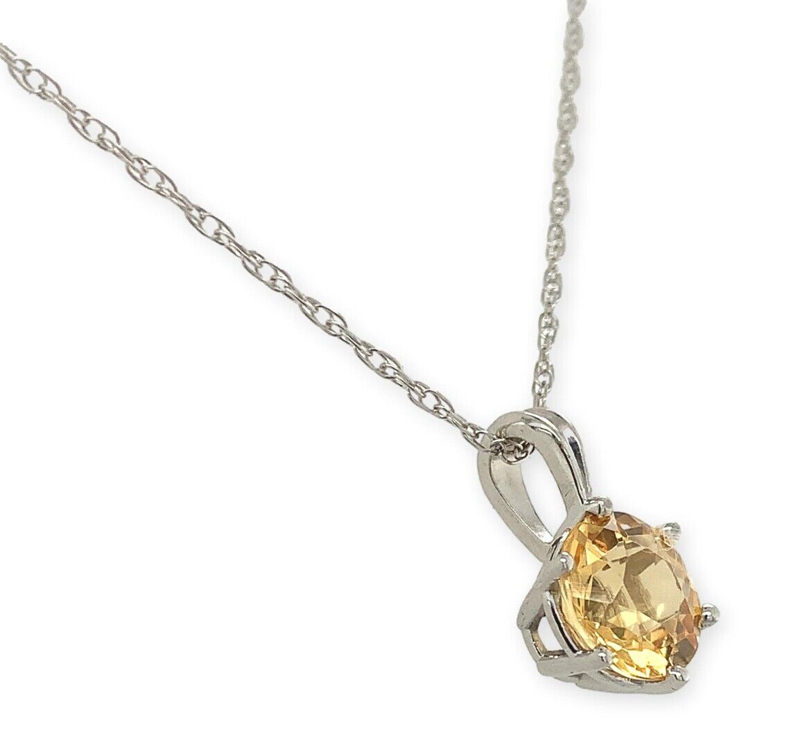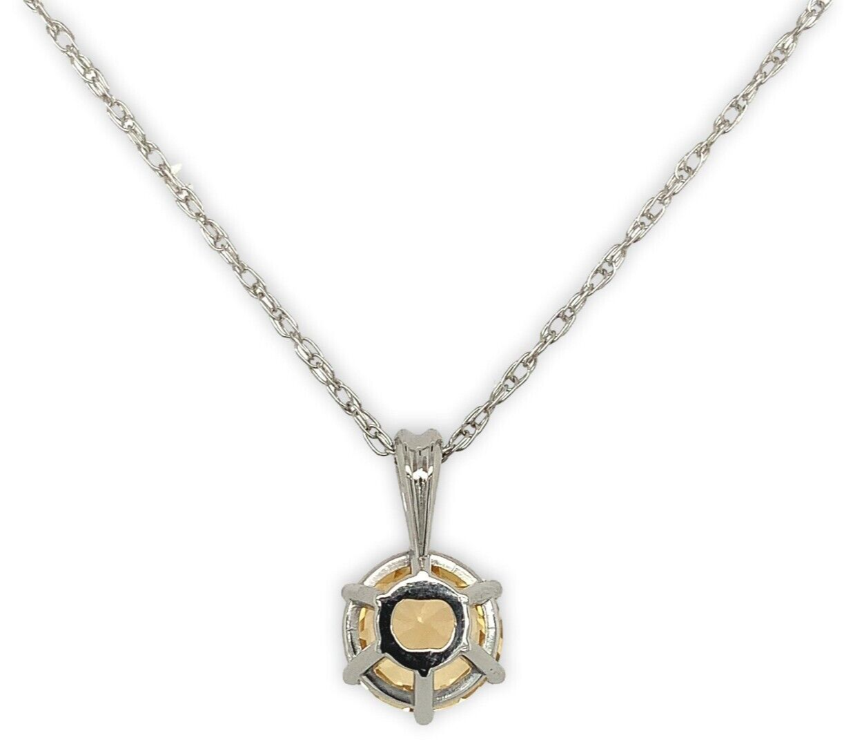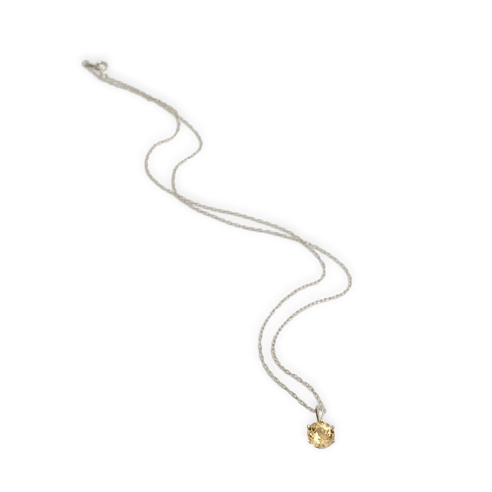 A platinum pendant featuring a round brilliant cut precious topaz weighing 1.98 carats. The topaz is a golden color and is set in a six prong basket. The topaz measures about 7.5mm. The pendant measures 1/2" long with bail and includes a new 18" platinum chain. The necklace weighs 1.82 dwt., and is new. Terrific!