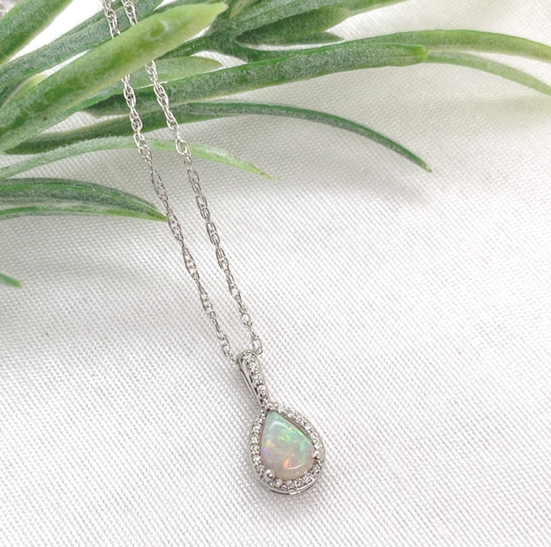 A platinum genuine earth mined Australian opal pendant with diamond halo. The pear cut opal measures about 7mm x 5mm and has lively play of color with all colors including red. The opal weighs .43 carats. There are twenty-one tiny round diamond accents weighing .05cts total.