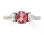 Platinum three stone ring featuring an oval natural padparadscha sapphire weighing 1.03 carats and diamonds. GIA report #2225462800 states natural sapphire measuring 6.62mm x 5.28 x 3035mm, stating pinkish orange color (with no other modifiers). The color is a bright punchy coral. The sapphire is accented by a pair of antique triangle diamonds weighing .51cts total and measuring about 4mm.