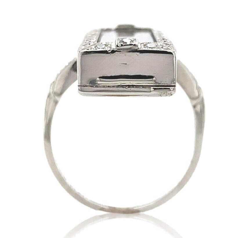 Platinum diamond ring converted from a vintage watch. The watch was removed and a piece of platinum was added in place of the crystal. The hinge is intact, and the former watch case opens from the underside. There are twenty-four original small single cut diamonds each measuring about 1.5mm.