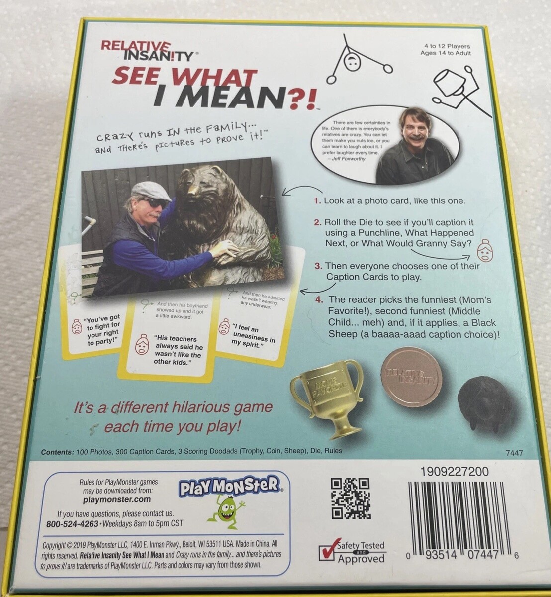 The PlayMonster Relative Insanity: See What I Mean?! is a party game with funny photos designed for 4 players aged 17 years and up. Released in 2019, this game is a fun and interactive way to engage with friends and family. With its entertaining gameplay and hilarious twists, this game is sure to provide hours of laughter and entertainment for any gathering.