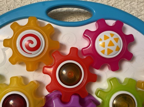 it's tactile fun for little fingers. Press the button and make the gears swirl and whirl. Plus, there's a convenient carry handle for toddlers on the move