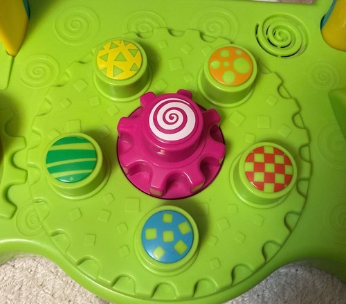 "Whirling, twirling, musical fun is on the way with this exciting Musical Gear Center. Your little one can push this button to activate the music and motion that will keep both their eyes and ears engaged. As they drop the ball onto the track, they'll watch with delight as it falls down the tube and then spins at the bottom. They'll love spinning the gears on the side to turn the friendly face around and around -- and when they get older, you can remove the gears so they can stack them and take their fun to 'new heights!' The active play, twirling fun and happy music just goes on and on."