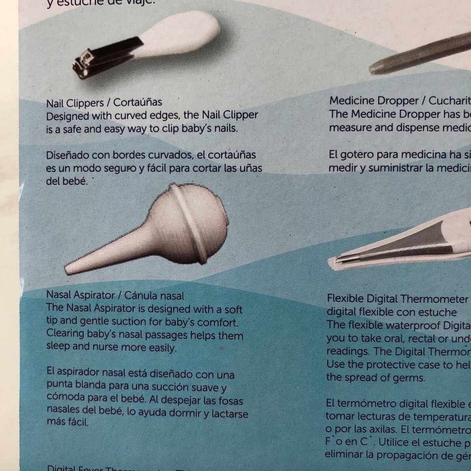 Lot of new 6 piece healthcare kit by Playtex. Kit includes: Designer Travel Case, Flex Tip Thermometer, Nail Clippers, Nasal Aspirator, Medicine Dropper, Medicine Spoon. You will receive exactly what is in photos. Please see all photos. We are a smoke free, pet friendly home. Have a great safe day! Fast ship!
