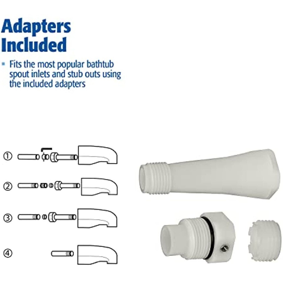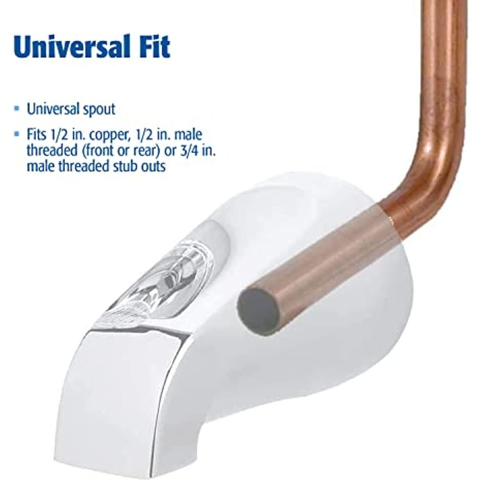 Plumb Pak PP825-33 universal fit bath tub spout without front diverter. Fits 1/2 inch copper 1/2 inch male threaded (front or rear) or 3/4 inch male threaded stub outs. Adapters included to fit all the most popular bath tub spout inlets (stub outs). chrome finish.