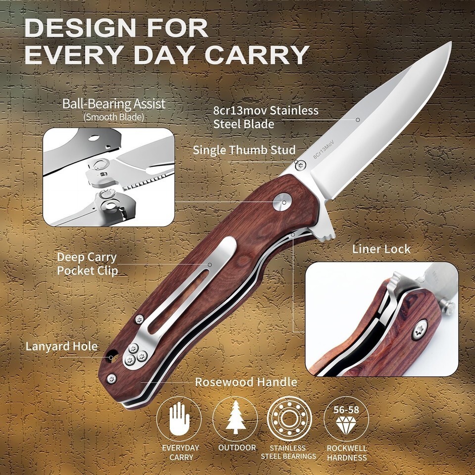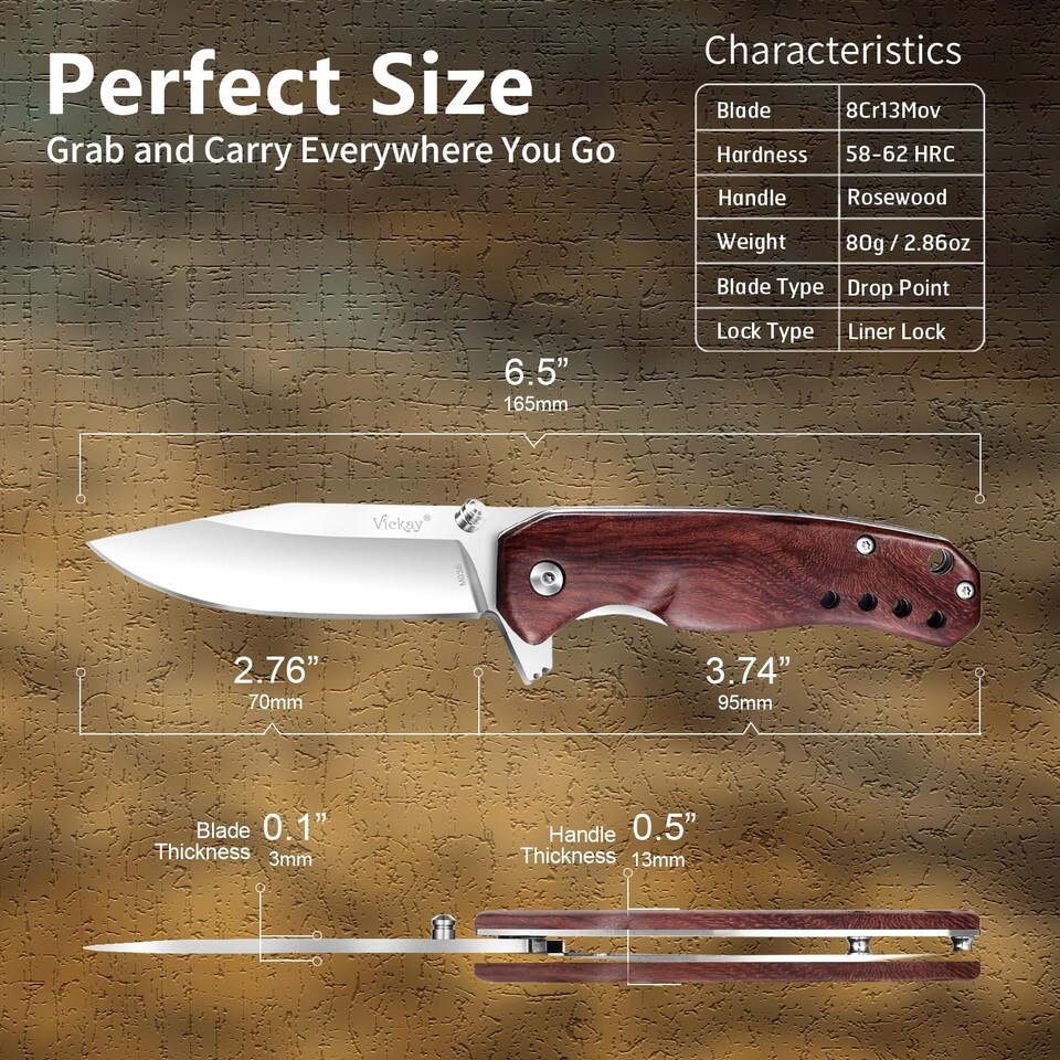 Pocket Knife for Men Pocket Folding Knives, 2.76" 8Cr13MoV Steel Blade, Wood Handle, Liner Lock Knife with Clip EDC Knife for Outdoor Camping, Fishing, Hunting, Tactical Gift