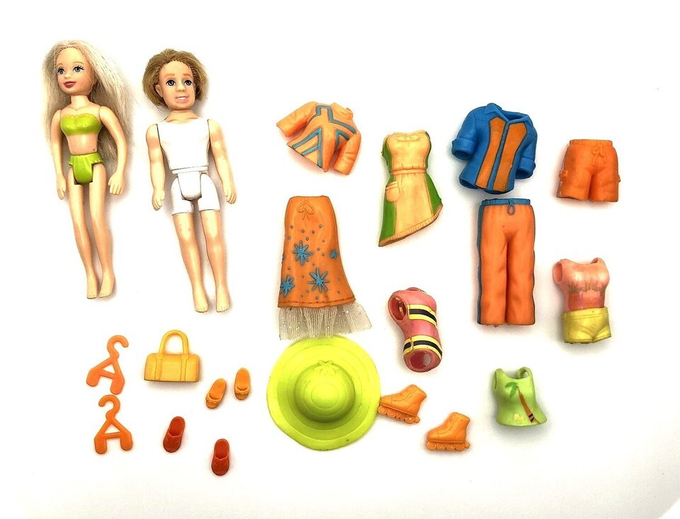 Polly Pocket Dolls Rick Polly Doll, Clothing, Shoes, and Accessories. The set comes with everything shown in the pictures. The clothing is made with a rubber material and the dolls are around 3 oe inches tall. The dolls and clothing are in good, pre-owned condition and do show a little wear from play. I do have more Polly Pocket dolls and mini dolls at my shop. Calculated shipping is applied to cart when you purchase multiple items at my shop.