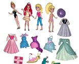 This Polly Pocket Figure Lot includes 4 dolls and 10 pieces of clothing and accessories. The dolls are 3 inches in size and feature blonde hair and light complexion. The set includes figures, and the material is plastic. The franchise is Polly Pocket, and the dolls are original. The dolls' eye color varies, and the hair type also varies.