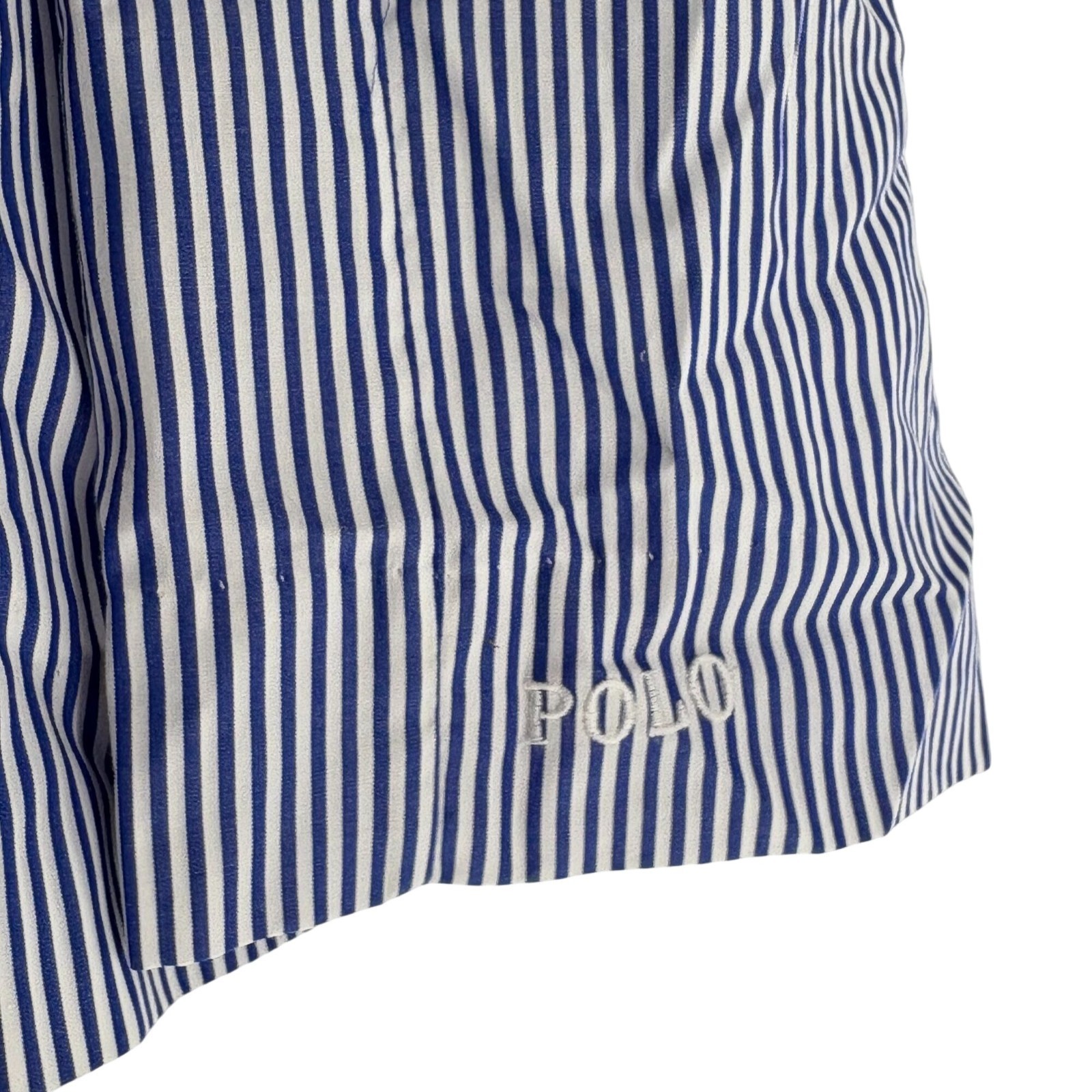 This Polo Ralph Lauren wrap dress offers a classic and elegant look. The blue and white stripes create a timeless style, while the wrap design adds a flattering silhouette. Made from quality cotton, it is comfortable for wearing throughout the day.