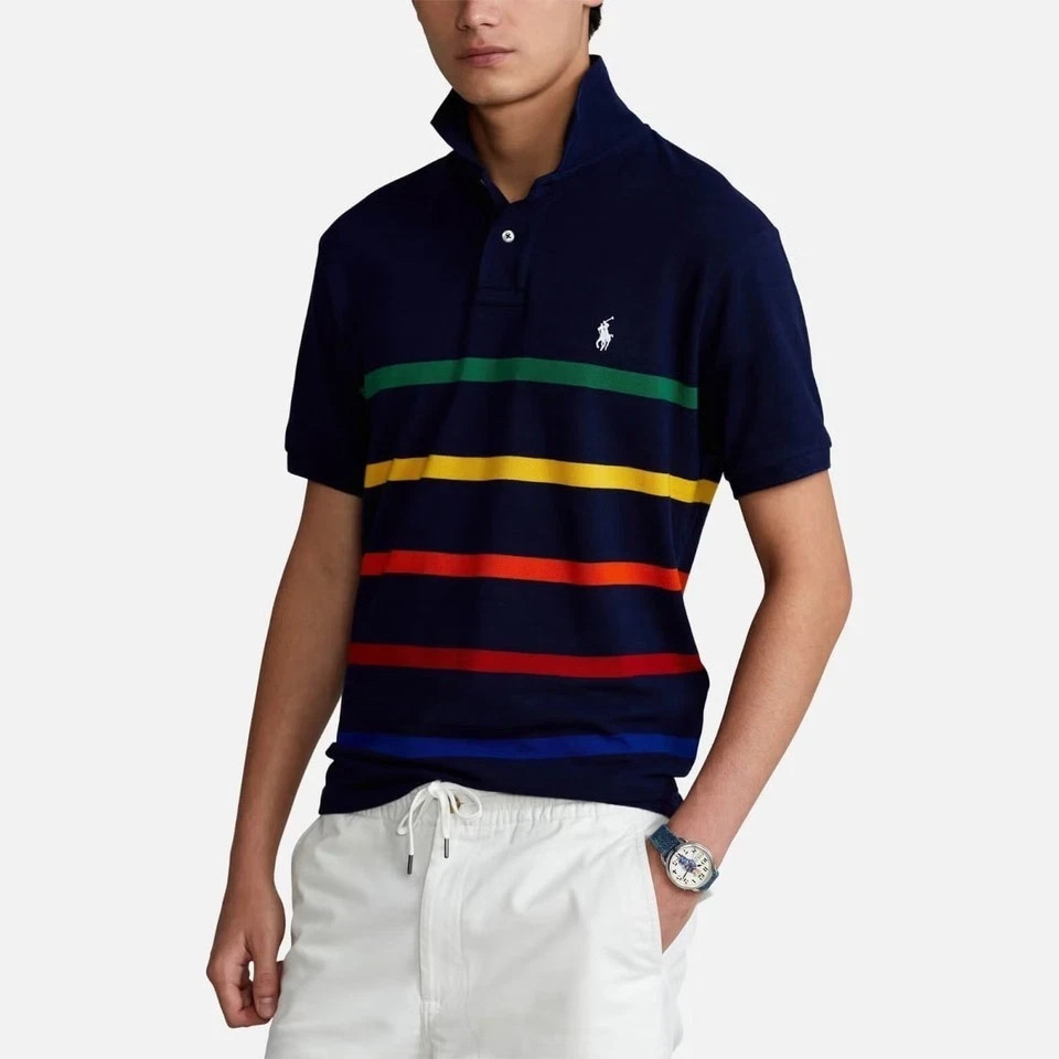 The Polo Ralph Lauren Shirt in Mesh with 5 Color Stripes is a classic fit, preppy polo shirt perfect for casual occasions during the summer and spring seasons. Made from breathable cotton knit fabric, this collared shirt features a spread collar and button closure. The shirt is accented with the iconic Polo Ralph Lauren logo and is machine washable for easy care. With its timeless multicolor striped pattern and medium size, this shirt embodies a classic outdoor, preppy theme that is versatile and stylish for various activities and settings.