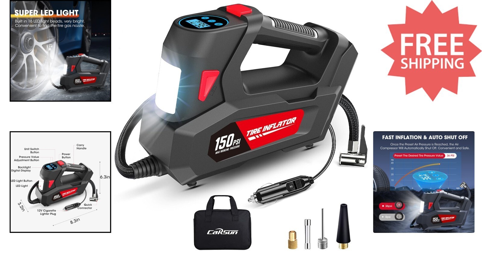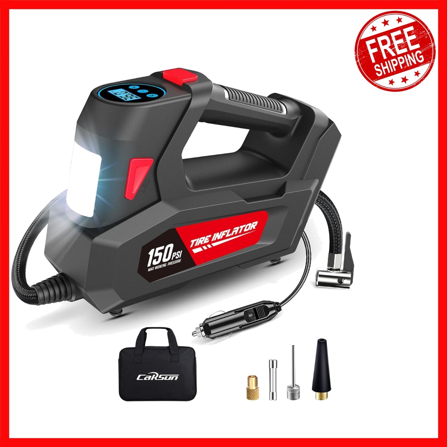 Experience rapid, effortless inflation with the CarSun Portable Air Compressor. Simply connect to your vehicle's 12V outlet, attach the hose, and flip the switch ? it inflates a 195/65/R15 tire from 0 to 35 PSI in under 5 minutes, boasting a maximum pressure of 150 PSI and an airflow rate of 35L/min. Designed for convenience, it features a built-in LED light with 16 lamp beads for nighttime use and a 10ft power cord for easy access to all tires. The device offers programmable pressure settings with easy unit conversions among PSI, KPA, BAR, and kg/cm, automatically shutting off upon reaching your desired pressure. Versatile with multiple nozzles, it handles car tires, motorcycles, bikes, sports balls, inflatables, and more. Compact and portable, it comes with a storage bag, replacement fuse, and accessories, making it the perfect gift and a reliable addition to your vehicle essentials. Make car life better with this efficient, multi-purpose air compressor.