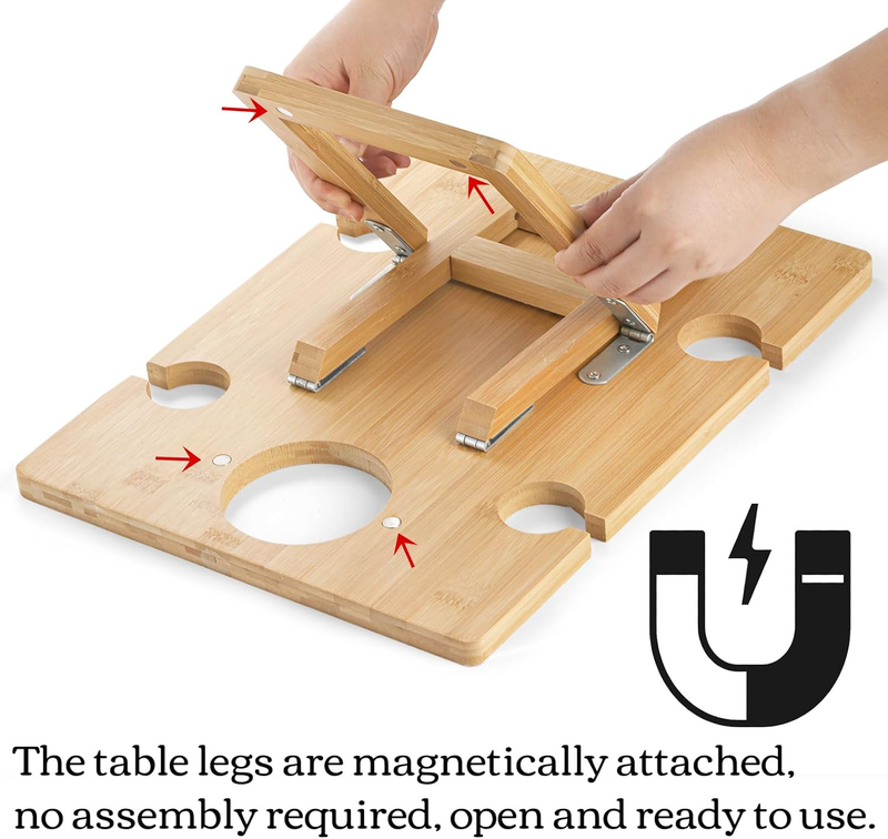 Sturdy Structure: Handmade from natural bamboo, the modern wine table is sturdy and well-made, durable and sturdy, non-odor, non-toxic and moisture-proof. 4 strong nails are added on each junction between the legs and board to enhance the stability. The table legs are magnetically attached, no assembly required, open and ready to use