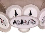 Portmeirion Sara Miller London Penguins Gray Footed Cake Stand 4 Dessert Plates