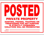 FOR SALE IS ONE (1) NEW 10" x 14" POSTED PRIVATE PROPERTY ALUMINUM METAL SIGN MANUFACTURED BY HILLMAN GROUP MPN 84159 UPC# 045899391359. THIS IS A STURDY METAL SIGN WITH WHITE BACKGROUND WITH BRIGHT RED FLUORESCENT LETTERING, PROVIDES HIGH CONTRAST COLORS TO EFFECTIVELY SEND THE MESSAGE. MADE IN THE USA, WEATHERPROOF ALUMINUM CONSTRUCTION WITH SAFE ROUNDED CORNERS AND FOUR PRE PUNCHED MOUNTING HOLES IN EACH CORNER. THIS METAL SIGN CAN BE MOUNTED WITH TAPE, NAILS, TACKS, STAPLE GUN OR WIRE TO FENCING, TREES, GROUND STAKE, PROPERTY BOUNDRIES, ETC. THE MESSAGE READS..... POSTED PRIVATE PROPERTY HUNTING, FISHING, TRAPPING OR TRESSPASSING FOR ANY PURPOSE IS STRICTLY FORBIDDEN VIOLATORS WILL BE PROSECUTED Name______________ Address__________ , WITH NAME AND ADDRESS BLANK TEXT FIELDS. THE BLANK TEXT FIELDS may BE FILLED IN WITH CONTACT INFORMATION USING A BOLD SHARPIE MARKER. ALUMINUM SIGNS WILL LAST LONGER THAN PLASTIC SIGNS SINCE THEY ARE RESISTANT TO THE ELEMENTS, MAINLY UV AND EVENTUAL CRACKING. HILLMAN GROUP OF CINCINATTI OHIO HAS BEEN MAKING QUALITY SIGNS SINCE 1964. YOU WILL RECEIVE ONE (1) POSTED PRIVATE PROPERTY 10" x 14" METAL SIGN SHIPPED BY USPS.....