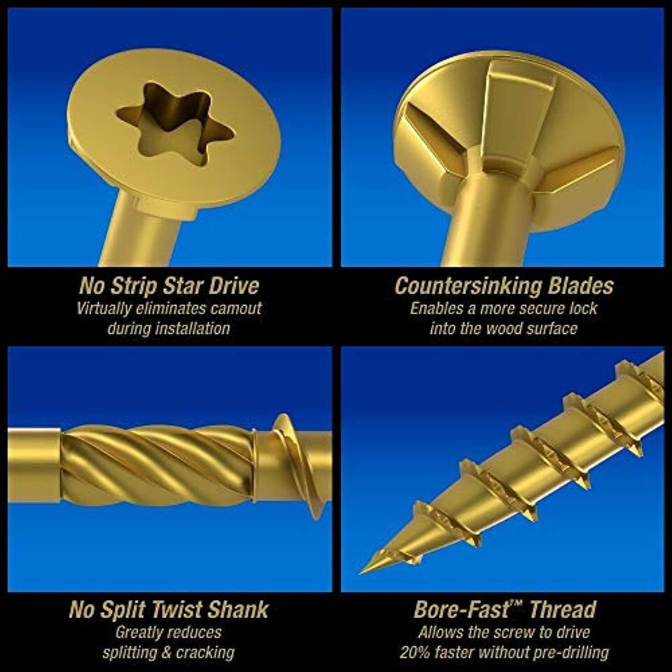 Power Pro premium exterior deck and wood screws feature a no-strip star drive, countersinking blades, no-split twist shank, and no pre-drill, Bore-Fast thread. redwood, and treated lumber for the life of the project. Common project applications include remodeling, fencing, storage assembly, cabinet assembly, and framing.