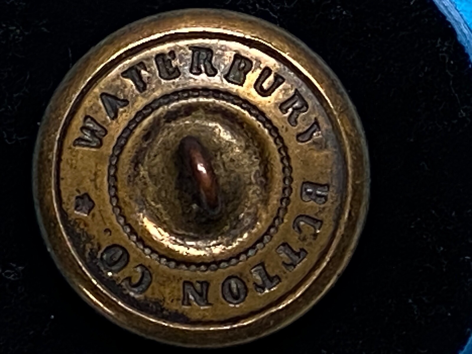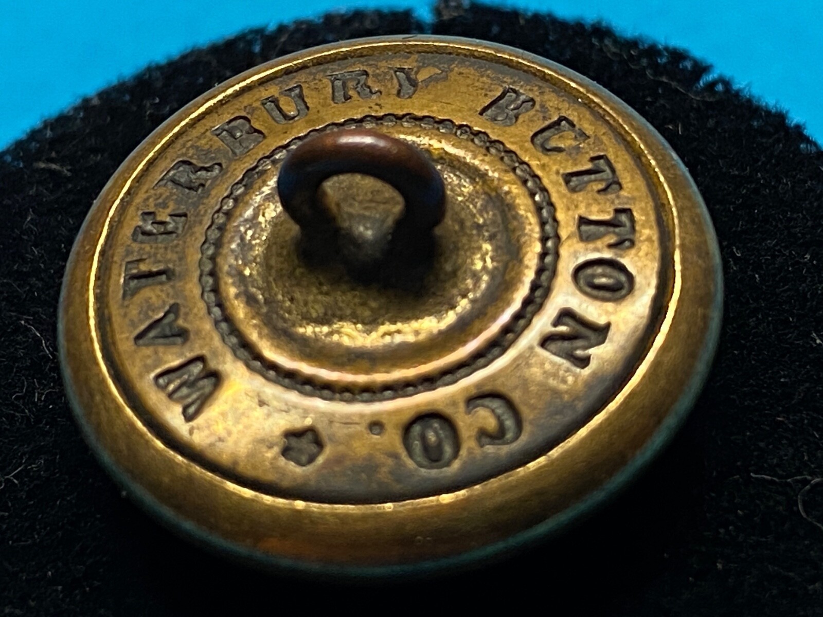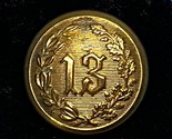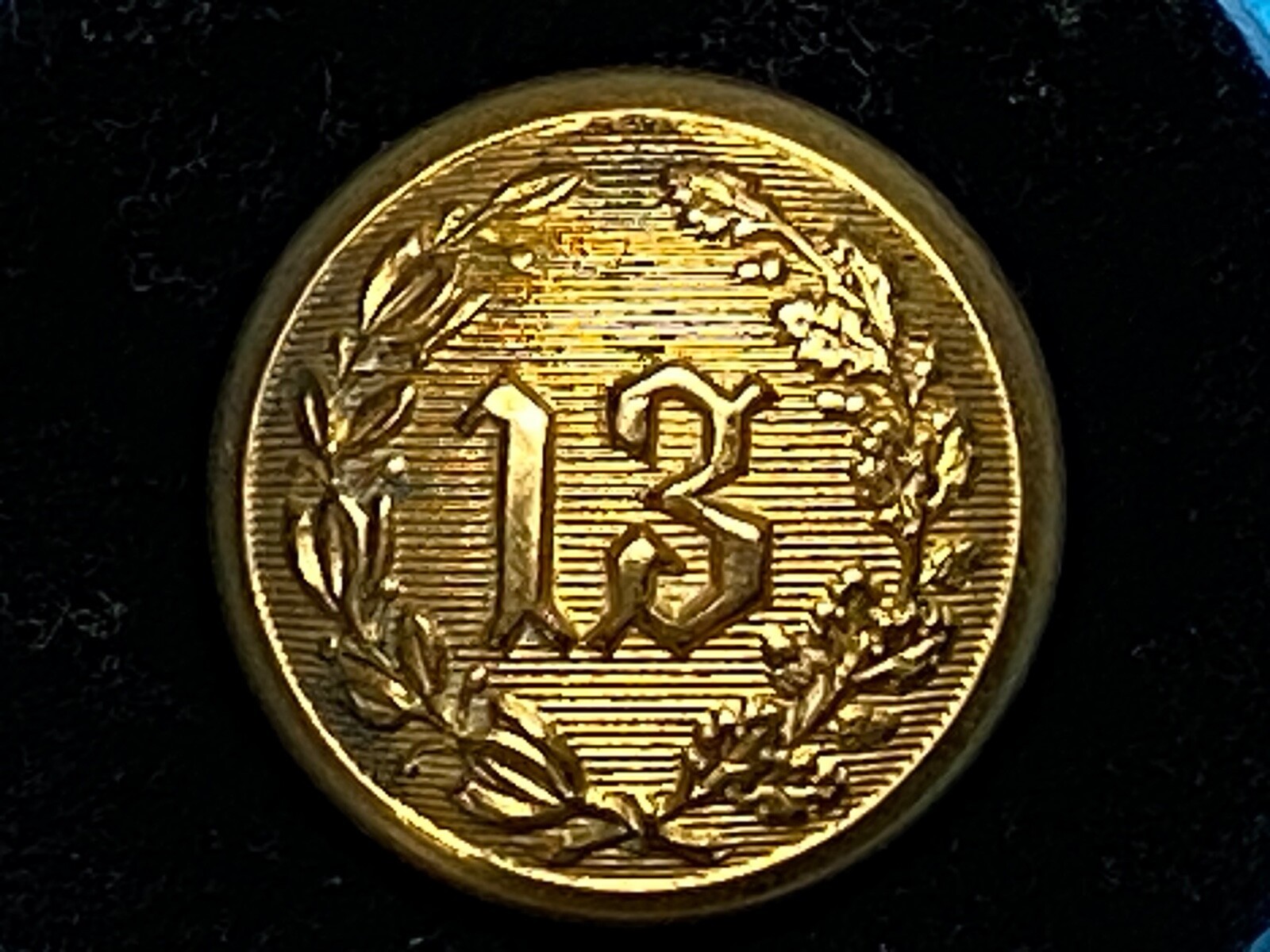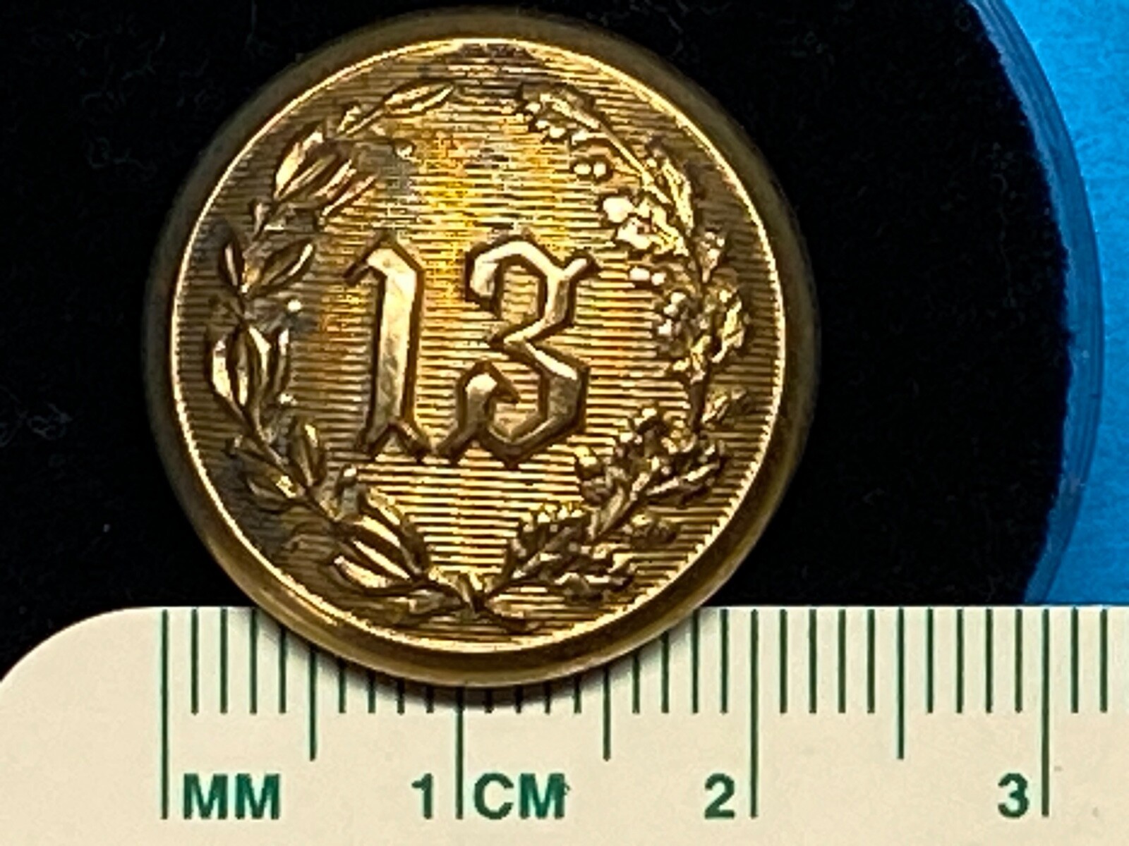 Non-excavated coat sized button of the 13th New York Militia Regiment the ?National Grays. The unit became the 87th New York Infantry during the Civil War, and in September 1862 was consolidated with the 40th New York Infantry. The face displays a "13" surrounded by a wreath on a lined field. The back retains a standup shank and the backmark ?WATERBURY BUTTON CO.?