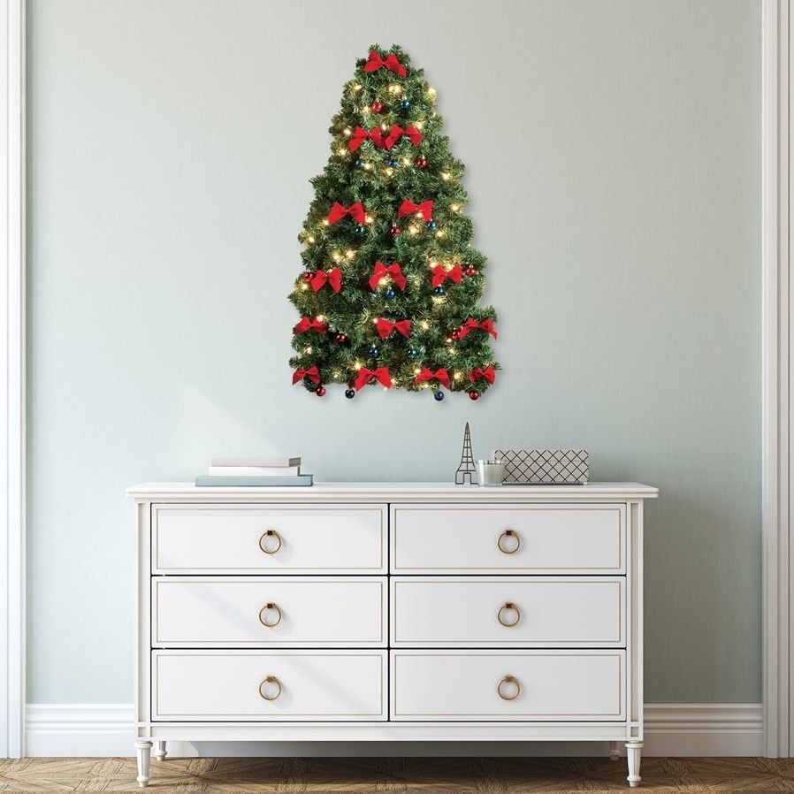 Enjoy the look of a traditional Christmas tree, even when you have little space. Realistic evergreen branches are adorned with white Christmas lights, ornaments and bows. Hang it up any where from a living room wall, an apartment to a dorm!