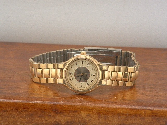 Pre-Owned Women?s Gold Color Bill Blass 001-2035 Dress Analog Watch -Stainless Steel Back-Quartz Movement -Stainless Steel Bezel-Stainless Steel Band-Dress Style-In Fair Condition -Blemishes -Some Color Fade -Gold Color-Fits up to 6 1/4 inch Wrist-Works!!!