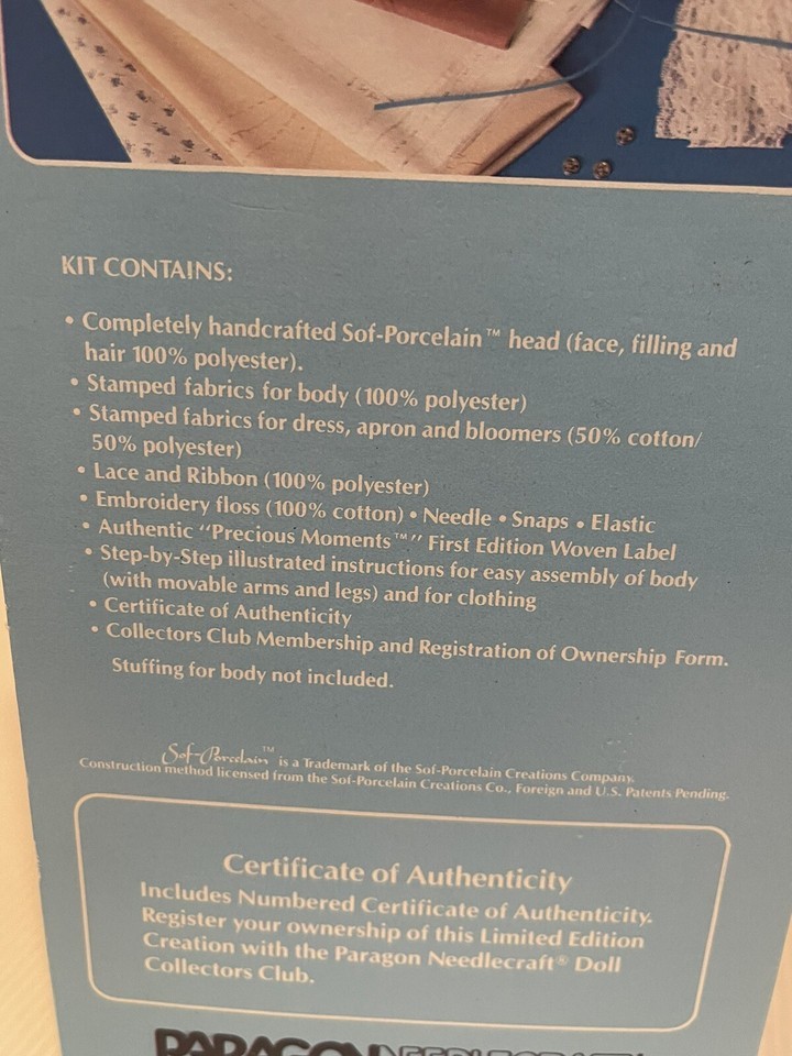 - PRECIOUS MOMENT'S 18" DOLL KIT 4000 PARAGON NEEDLE CRAFT 1985 1ST EDITION