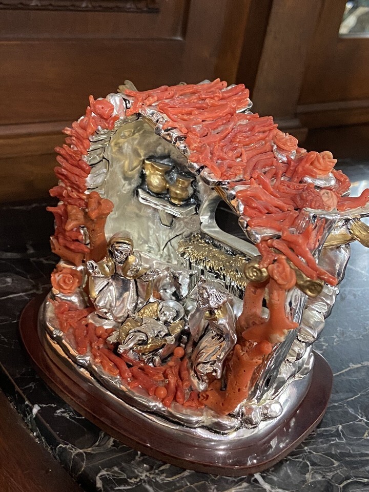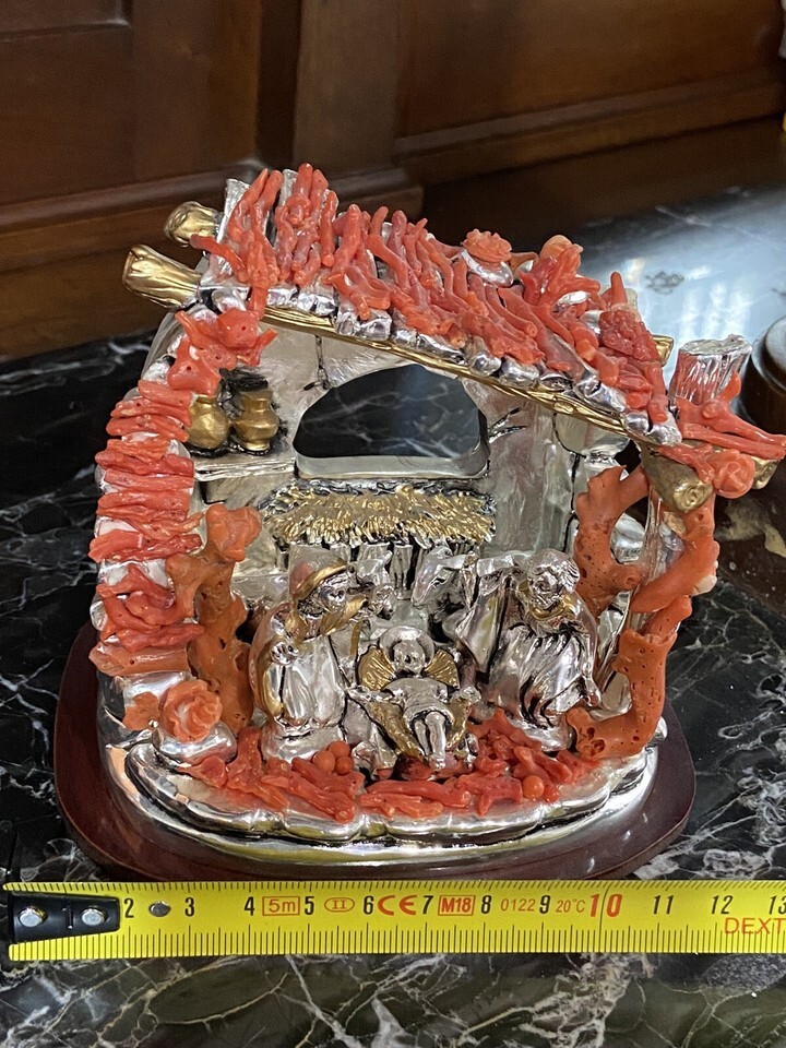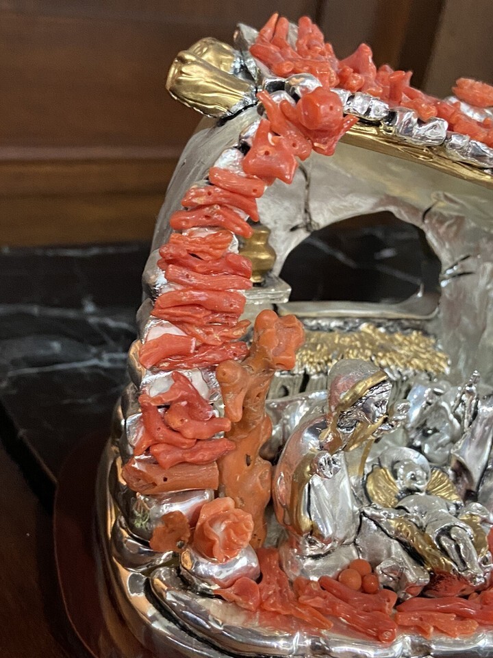 Presepe bagno argento arricchito, manualmente, da corallo naturale.