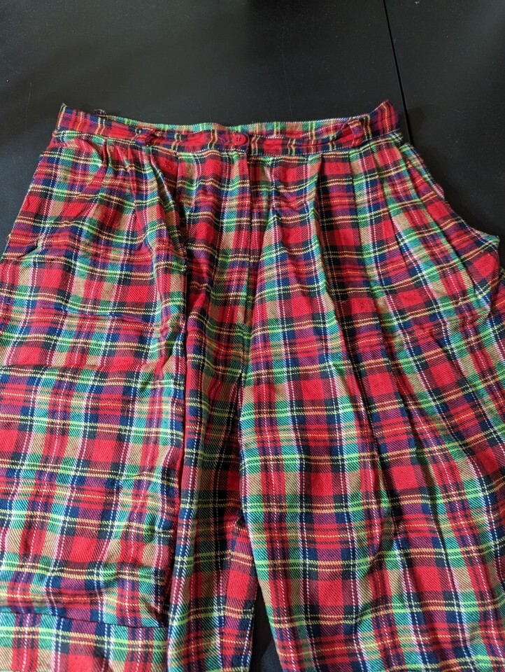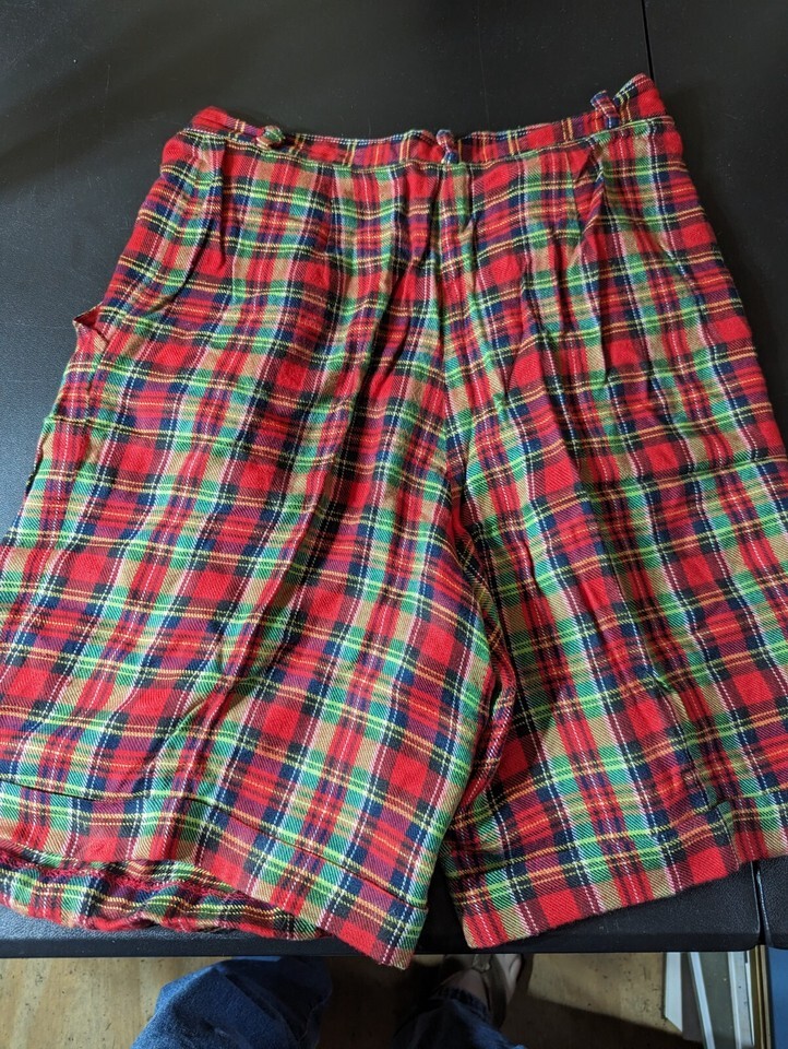 The product is a pair of women's shorts made by Preston York. They are plaid with a multicolor pattern and have a button closure. The shorts are made of 100% rayon and are pleated at the front. They have a waist size of 28 inches and are a size 10. The shorts are dry clean only and have slash pockets. They are a vintage style and have a comfortable fit. The product is not personalized and was not handmade.