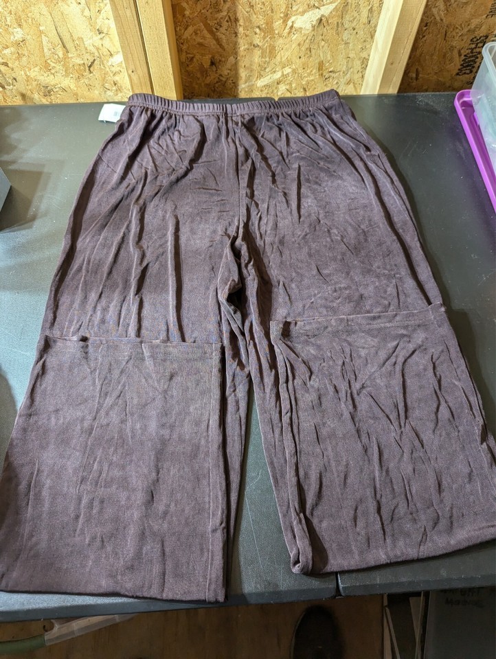 Elevate your travel or casual wardrobe with these stylish Preston and York ladies brown stretch pants. The pants are crafted from a comfortable knit fabric that features a solid pattern and a flat front design. The elastic waistband and stretchy spandex and acetate material make them perfect for all seasons and occasions.