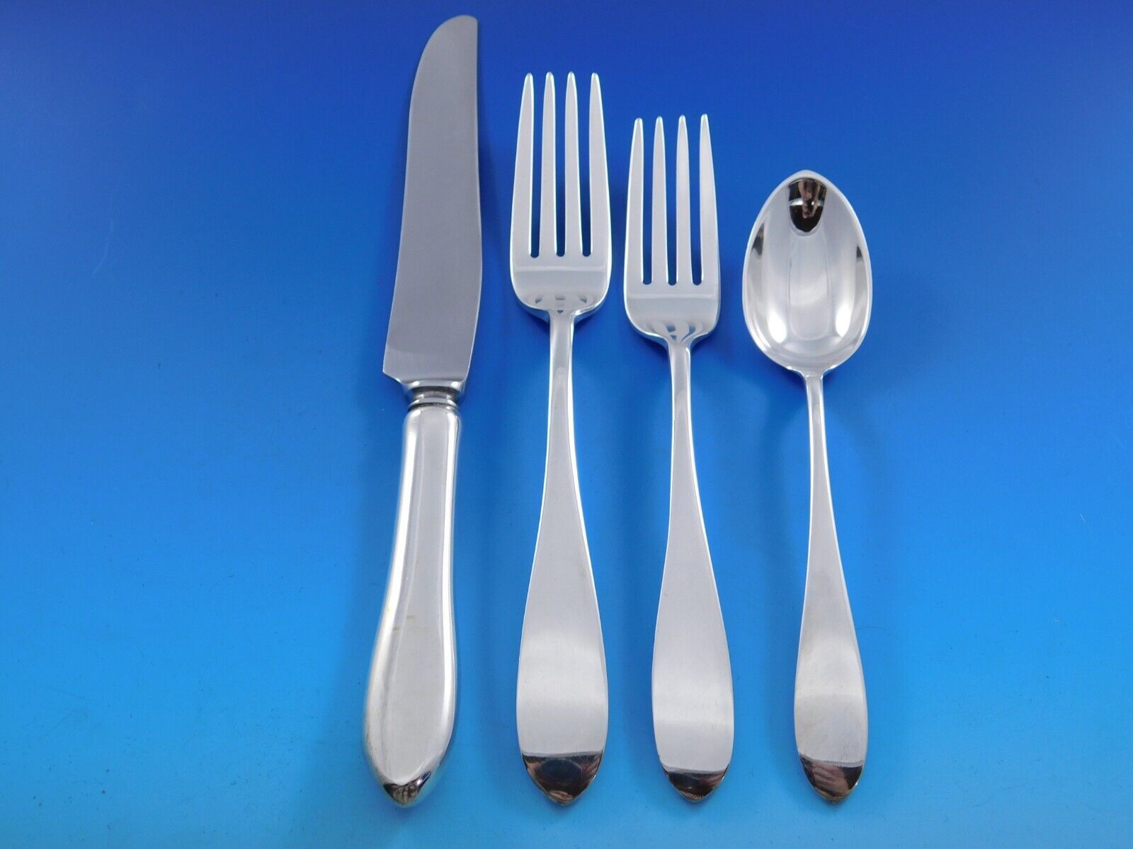 Rare Dinner size Princess by George C. Erickson handwrought sterling silver Flatware set - 79 pieces. Georg Erickson worked for Arthur J Stone between 1915-1932, where he learned to make hand wrought silver. He then opened his own thriving silver shop that is owned today by his son, Peter, where he still forges fine made to order. This pattern was introduced in the year 1932. This set includes: