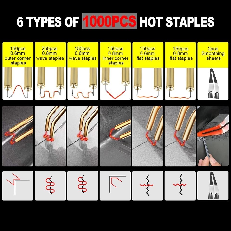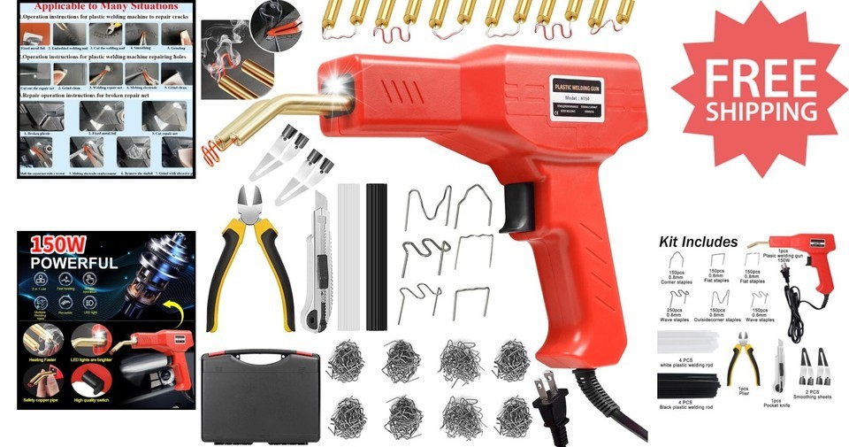Upgrade your repair toolkit with our advanced 150W plastic welding machine, designed for professional results. This comprehensive kit includes 6 types of hot staples (over 1000 pieces), 8 welding rods, and 2 thermal smoothing heads?eliminating the need for additional purchases and reducing costs. Its fast heating capability ensures instant readiness, while the overheating protection guarantees safe operation and durable repairs. Easy to use, with front LED indicators for visibility in low light, simply select the appropriate staple, melt it into the plastic, and smooth the surface seamlessly. Compatible with 98% of plastic products on the market, this versatile kit is perfect for automotive, household, or industrial repairs. Packaged with a carrying case, pliers, and utility knife, it?s your go-to solution for professional-grade plastic repairs. To ensure fast and reliable delivery, we work with multiple fulfillment partners and suppliers. Depending on availability and location, your order may ship from different warehouses or arrive in packaging that varies from item to item. Tracking details are typically provided shortly after shipment, and customer satisfaction remains our top priority.