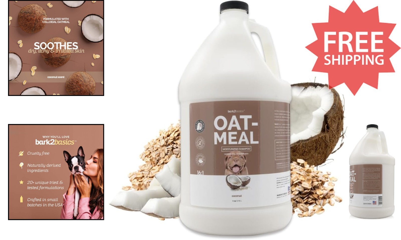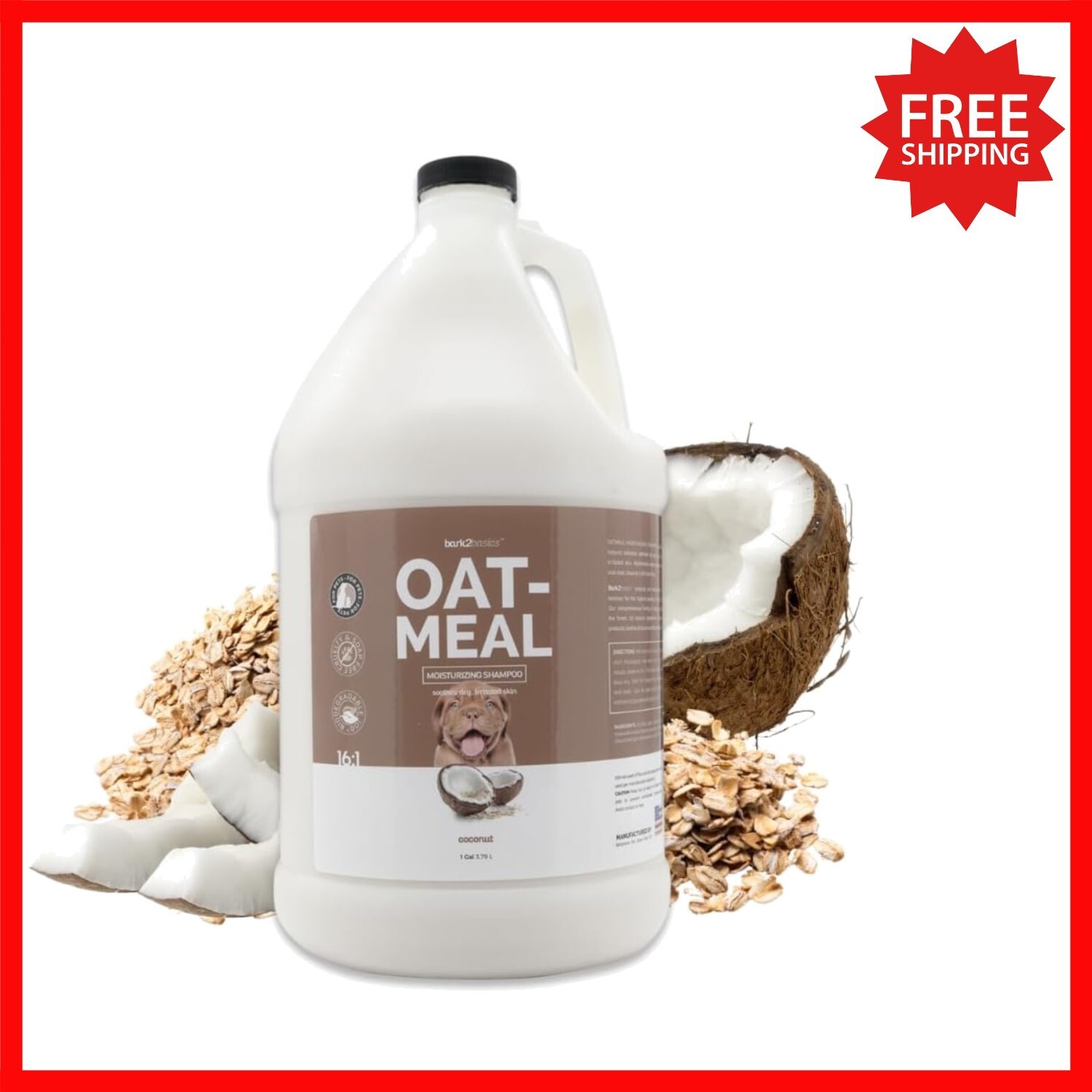 Experience the gentle soothing power of our professional-grade pet shampoo, crafted with natural colloidal oatmeal to calm dry, itchy skin in dogs and puppies of all breeds and ages. Infused with a nourishing coconut fragrance, it leaves coats feeling silky soft and refreshed. Used by grooming professionals worldwide, this concentrated formula yields up to 16 gallons?dilute as needed for economical, salon-quality care. Made proudly in the USA with high-quality, naturally derived ingredients, it's cruelty-free, soap-free, paraben-free, and biodegradable, ensuring gentle yet effective cleansing. Enjoy a safe, luxurious grooming experience for your furry friend.