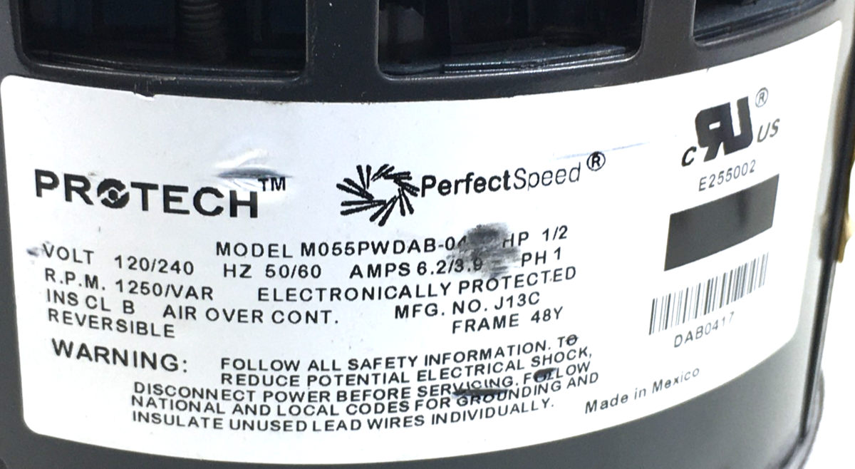 This is PROTECH M055PWDAB-0417 Blower Motor Rheem Ruud 51-104389-01 1/2HP 120/240V CCW Lead End rotation, used motor.