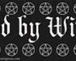 11.5 x 3 inch bumper sticker; background is black, with white lettering, and a border of pentacles.