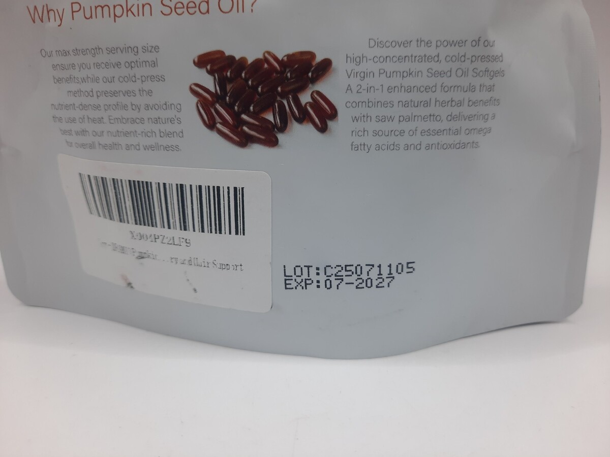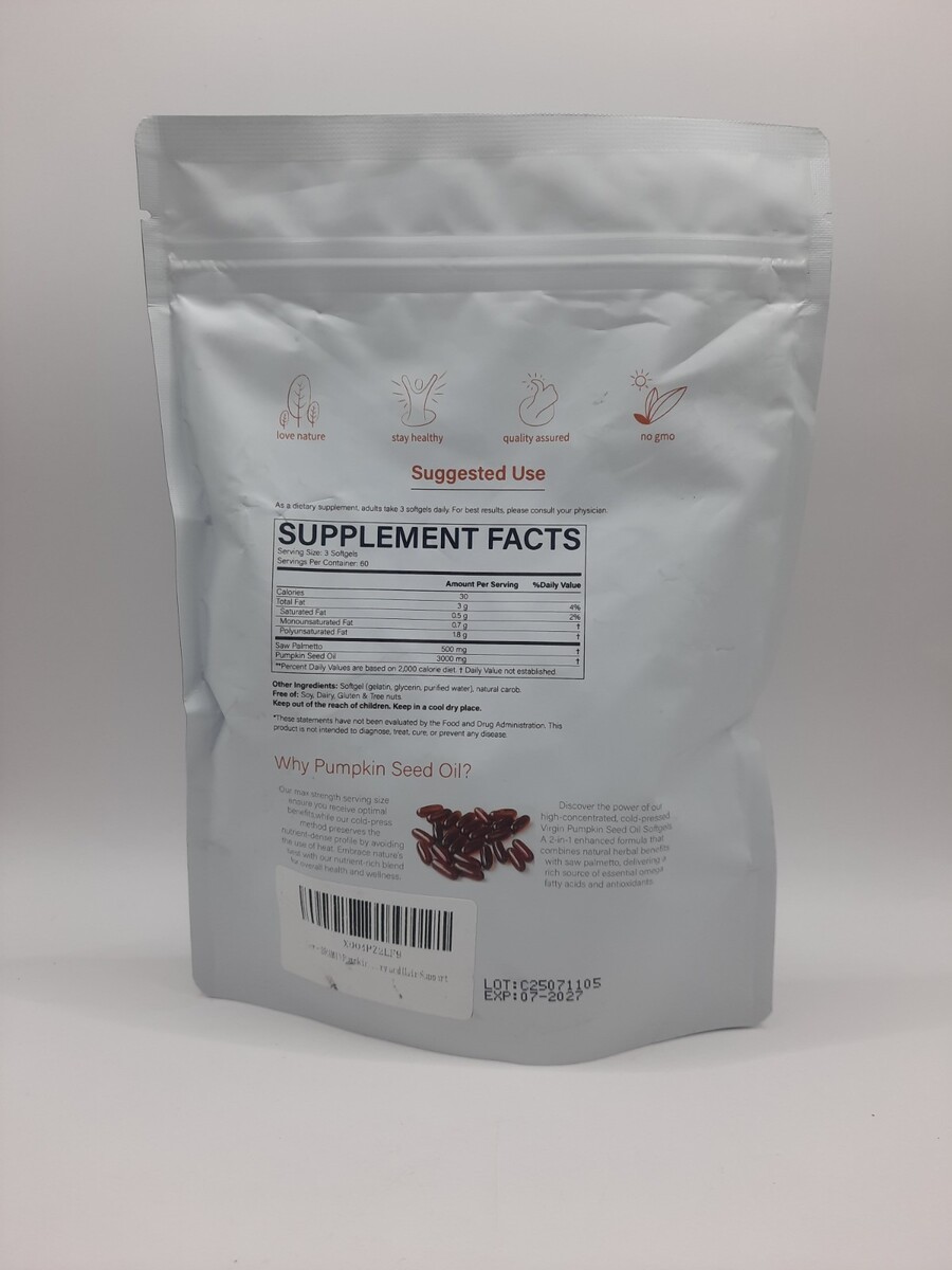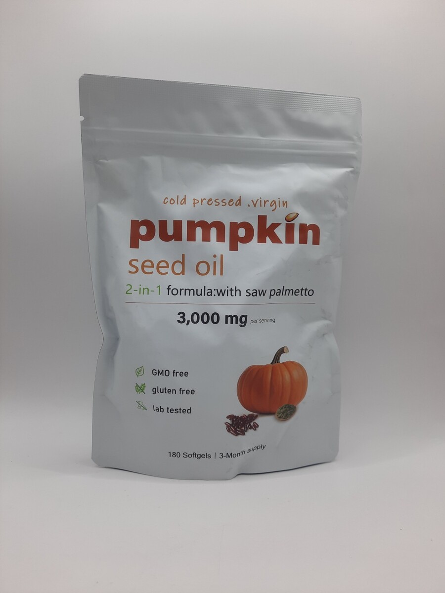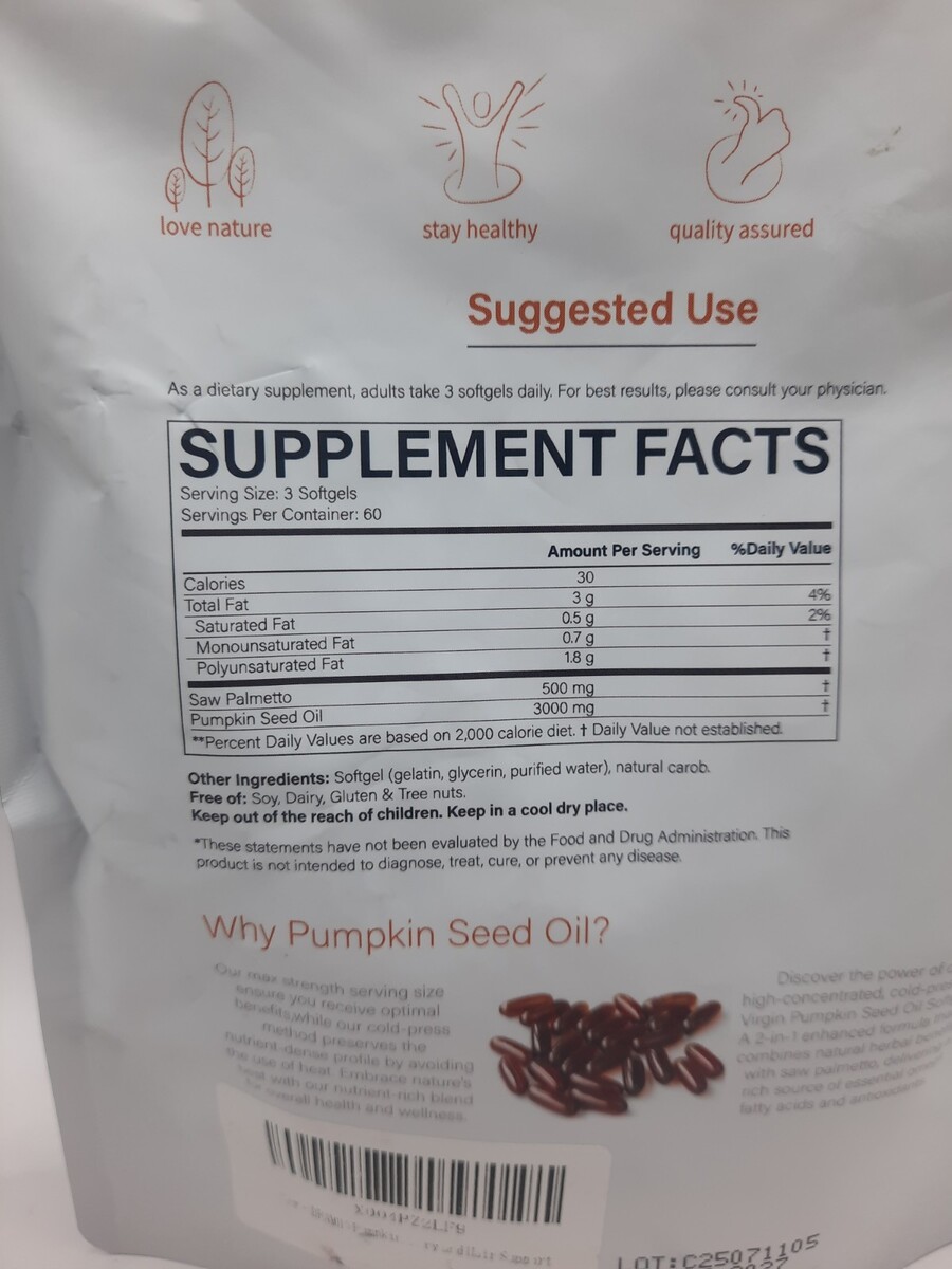 - Pumpkin Seed Oil with Saw Palmetto, 3000mg Per Serving, 180 SG Caps Exp 07/2027