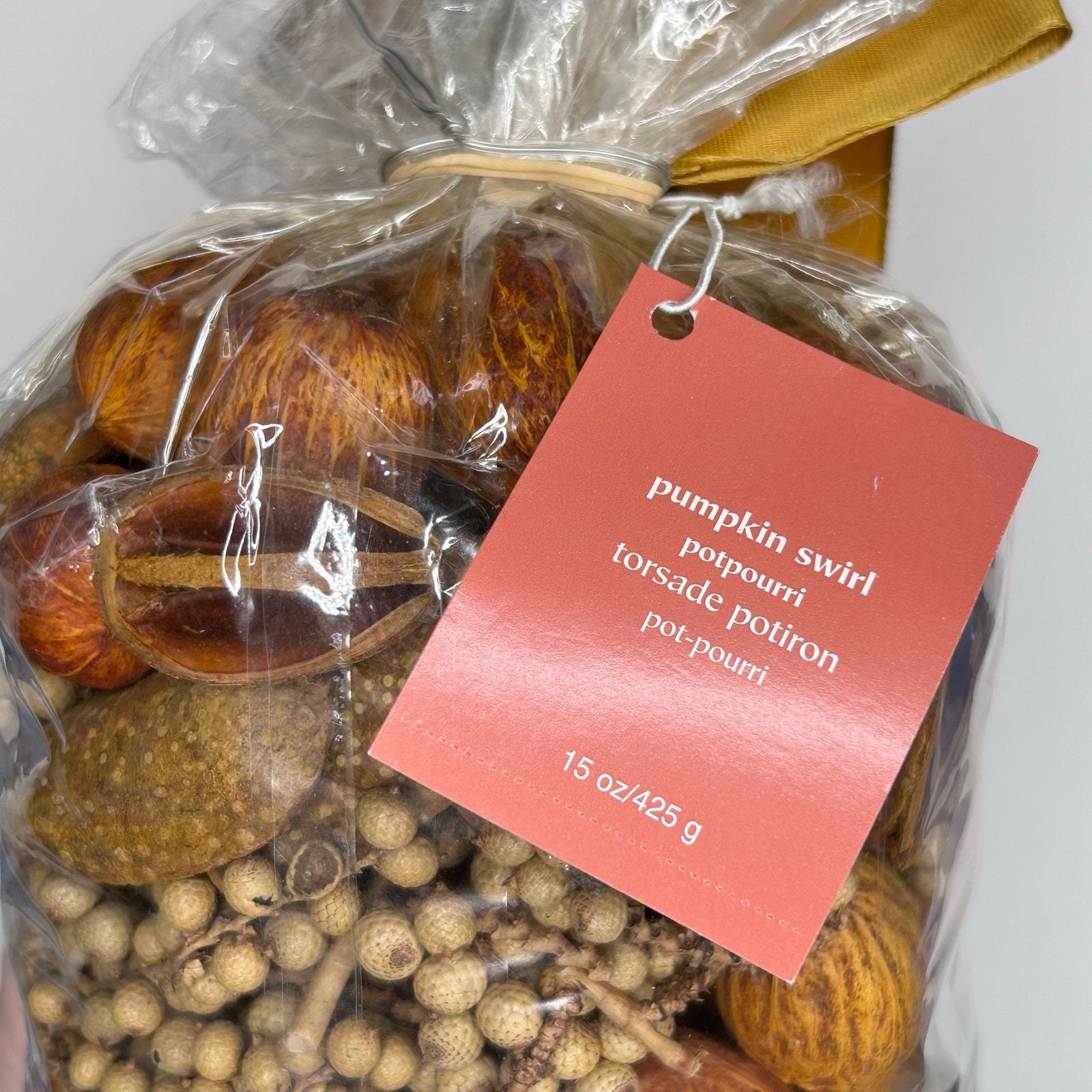 Pumpkin Swirl Potpourri by Pier 1 Imports ? Large bag filled with an aromatic blend of pods, seeds, pumpkin accents, wheat, and seasonal botanicals. Perfect for creating a cozy autumn ambiance in your home or as a thoughtful gift. Beautifully packaged and ideal for displays or filling decorative bowls.