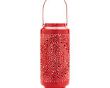 Vibrant Design: Bold red finish and intricate punched metal details bring a pop of color and light to your decor. Ambient Glow: The punched metal design casts lovely patterns, enhancing the warm, soft glow of a 4" pillar candle (not included). Versatile and Portable: Equipped with a handle for easy carrying, making it ideal for both indoor and outdoor use. Suitable for indoor use only