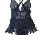 Sheer fringe navy teddy with seductive floral lace panels and a criss cross back