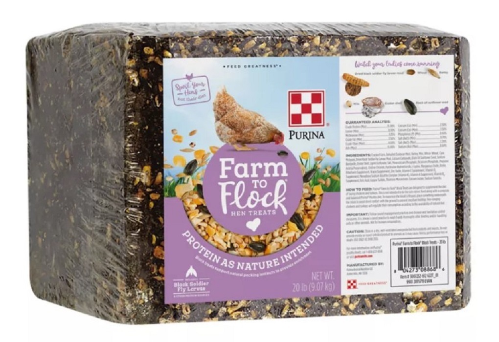 Block treats support natural pecking instincts to provide enrichment for chickens. Purina Farm to Flock Block Treat is designed to supplement the diet of laying chickens and turkeys. This is not intended to be the sole ration. Feed along with a complete and balanced Purina Poultry diet.