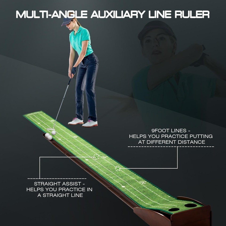 Putting matt for indoors includes a walnut automatic ball return system. The hole is designed to simulate the slope of a golf course, there is a ball box at the end of the runway. Say goodbye to chasing the ball and enjoy uninterrupted practice time.