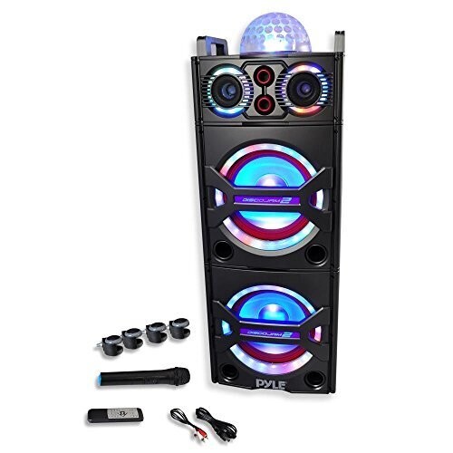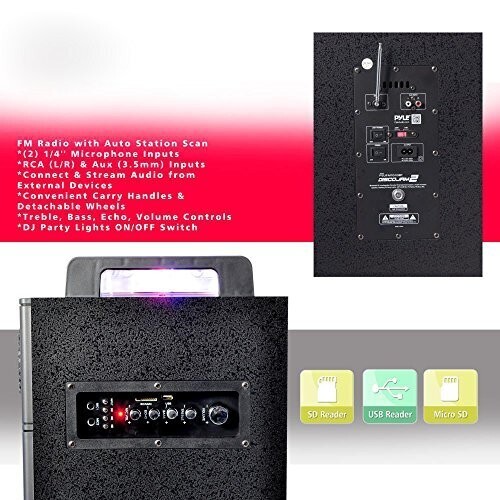 Pump up the party with the Pyle Karaoke Speaker Systems. Enjoy plenty of music streaming options that will add life to any occasion. Included wireless microphone makes it perfect for singalong karaoke parties, Bluetooth audio streaming plays all of your favorite songs wirelessly, and the builtin flashing DJ party lights add visual effects to the highpowered sound Use the system at home, on stage or in the auditorium it's perfect for all of your audio and crowd control needs. Convenient carry handle and rolling wheels allow you to easily transport the speaker system to quickly post up and party Additional features include, USB SD Memory Card Readers, FM Radio along with the ability to connect additional microphones. Get the party going with the Pyle Disco Jam 2 Speaker Systems. If there is static noise while playing music, it's most likely related to a bad cable/connection on one of the Aux Ports/Cables connected to them. Make sure to firmly connect any cables you are using, and when not using the cable to disconnect them, like when you are using Bluetooth.