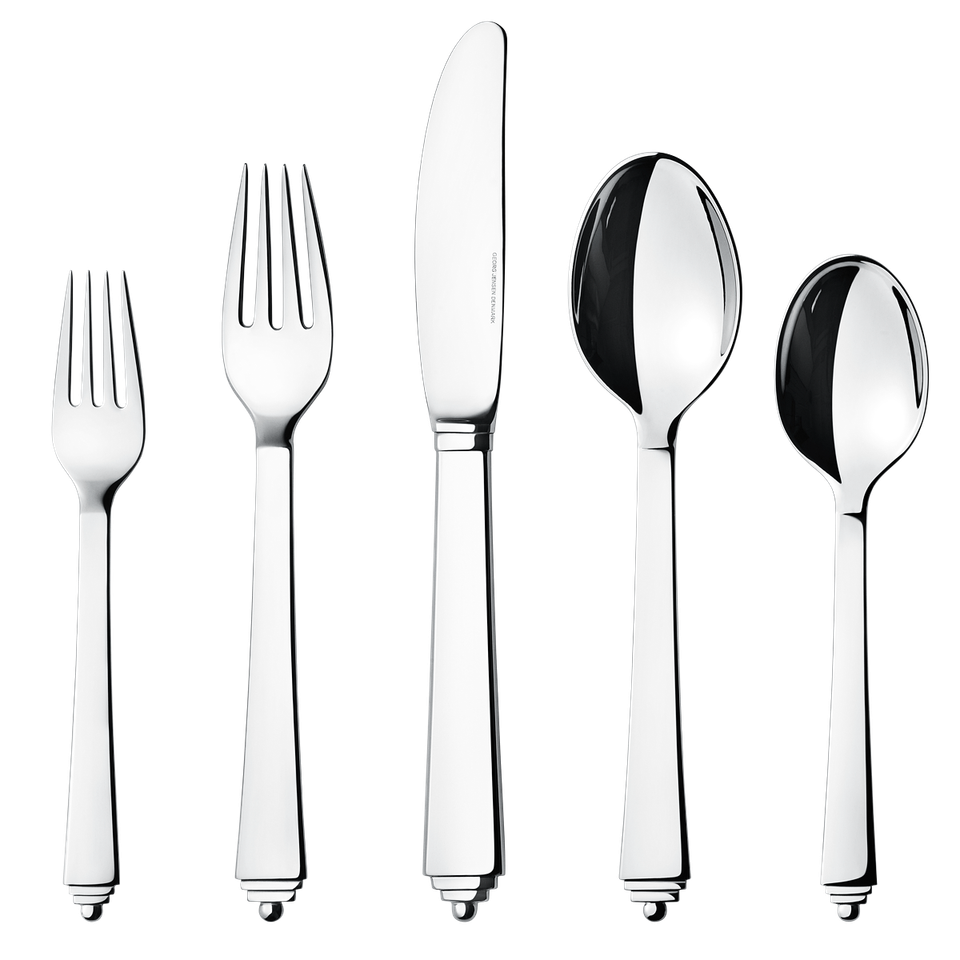 The classic lines of Art Deco never go out of style so add a touch of sophisticated elegance to your table top with Pyramid cutlery and its distinctive stepped ziggurat motif. Designed by silversmith in 1926, this five piece stainless steel set is the perfect way to start a larger collection and ensure every meal time is a special occasion.