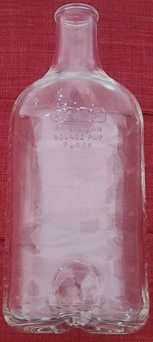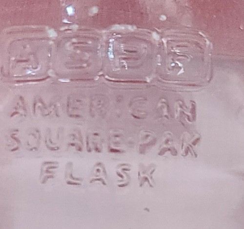 One (1) side is clear with an indentation in bottom and ASPF ~ American Square Pak Flask written on it in raised lettering