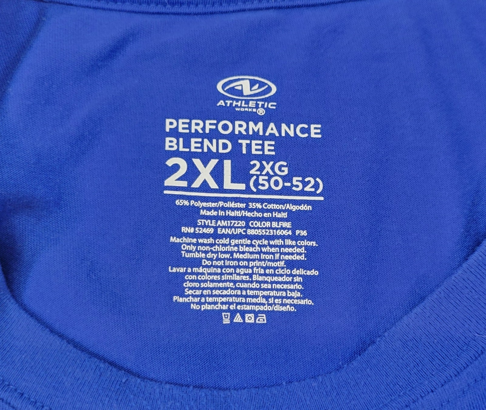 - QQ) Athletic Works Men Royal Blue T-Shirt Performance Blend Tee 2XL