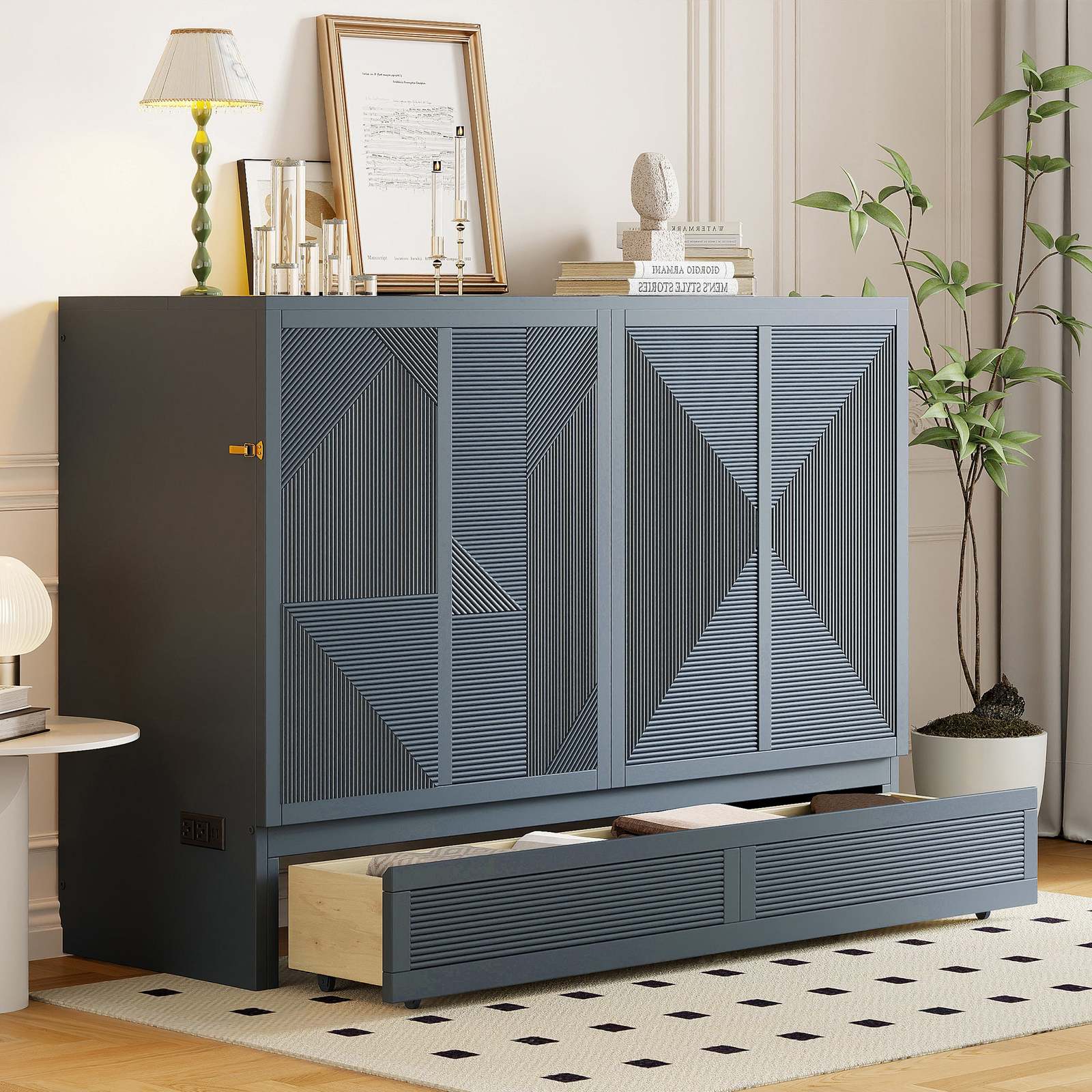 Queen Murphy Bed Gray: Large Drawer, USB & Outlets